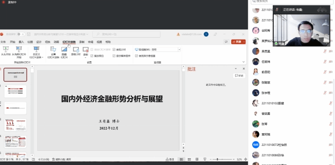 金融硕士系列讲座“国内外经济金融形势分析与展望”以线上腾讯会议的形式顺利举行,中国银行研究院高级研究员王有鑫受邀开展讲座。本次讲座由金融硕士教育中心执行主任胡育蓉主持。金融硕士点负责人张琴教授及全体金融专硕研究生参加。