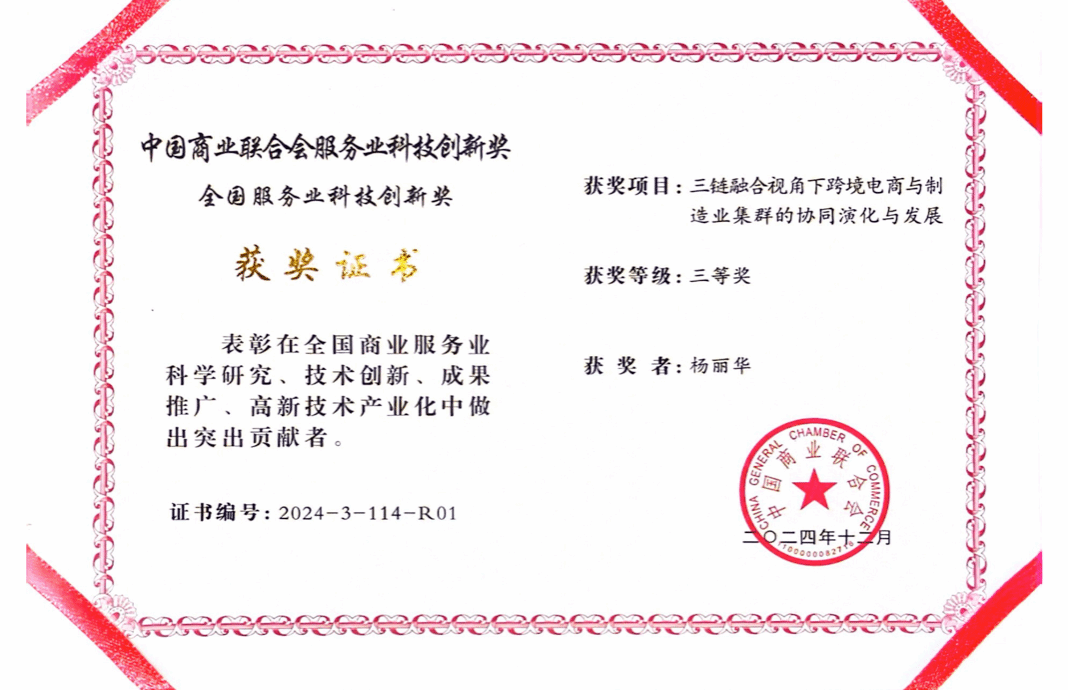 2025年7月20日,中国商业联合会主办的2025年全国商业科技质量大会在北京友谊宾馆召开。大会为“以科技创新引领新质生产力发展”为主题。我校MIB学位点负责人杨丽华教授的研究成果《三链融合视角下跨境电商与制造业集群的协同演化与发展》,获中国商业联合会服务业科技创新奖全国服务业科技创新奖三等奖。