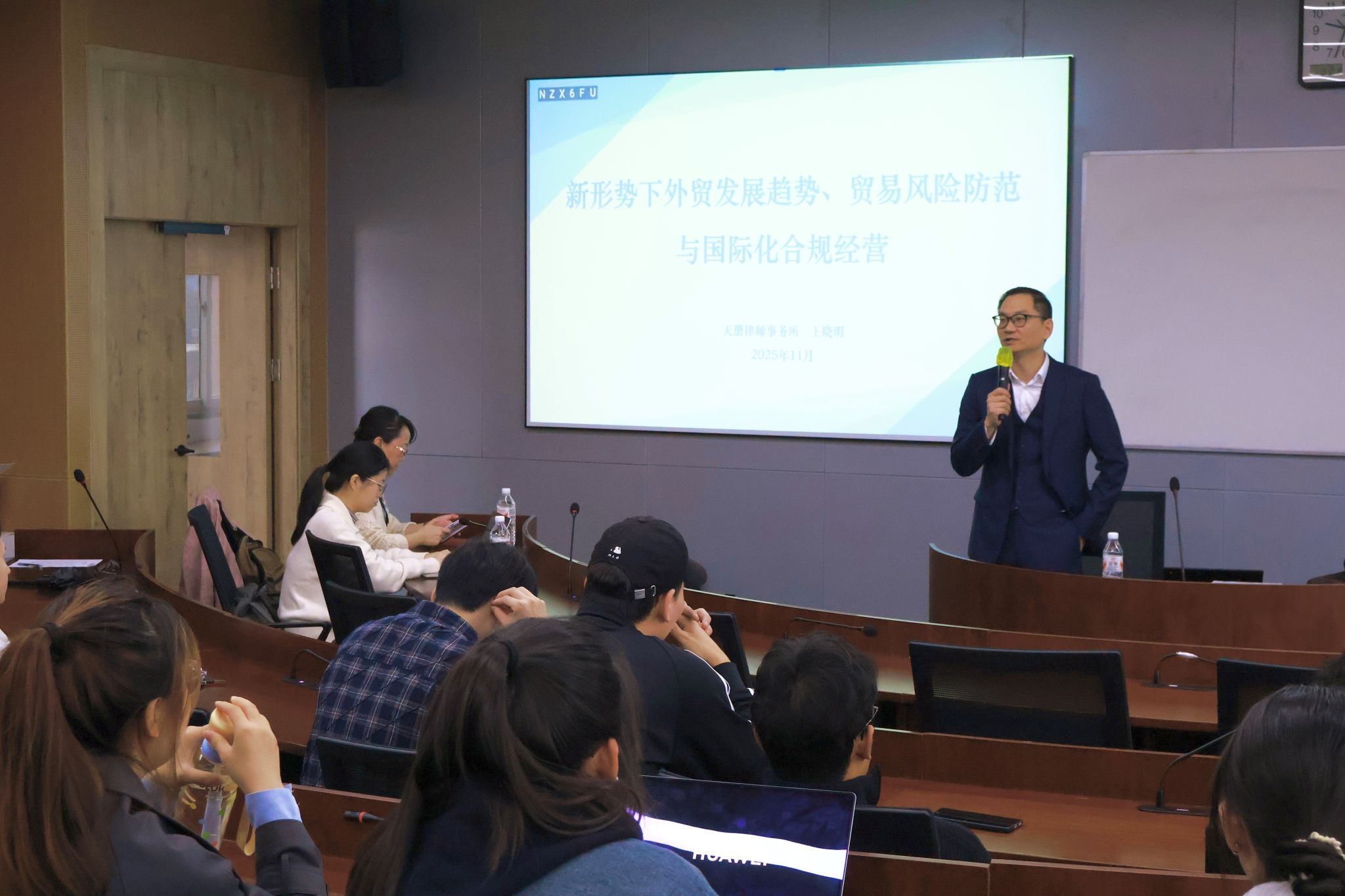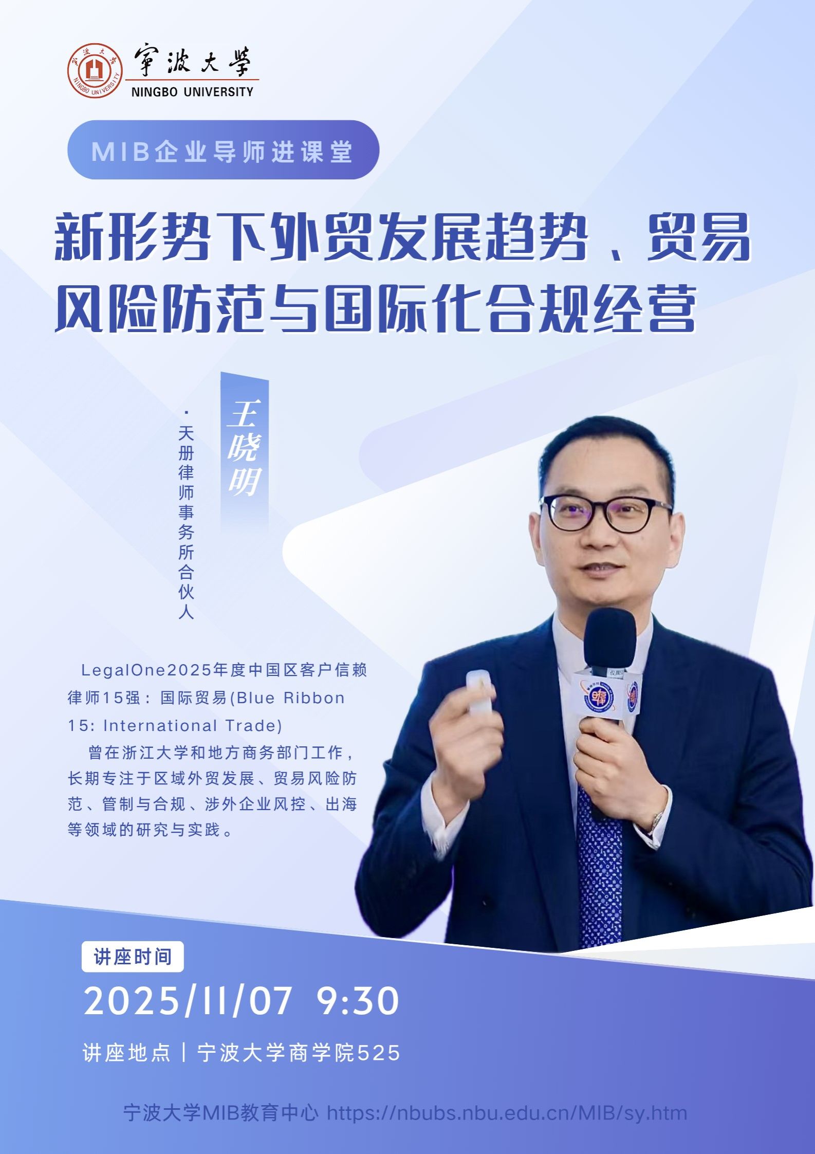 525报告厅举行。本次讲座特邀MIB校外兼职导师、天册律师事务所合伙人王晓明律师走进MIB《国际贸易政策与实务》课堂,以“新形势下外贸发展趋势、贸易风险防范与国际化合规经营”为主题,为MIB师生带来一场理论与实践深度融合的学术盛宴。