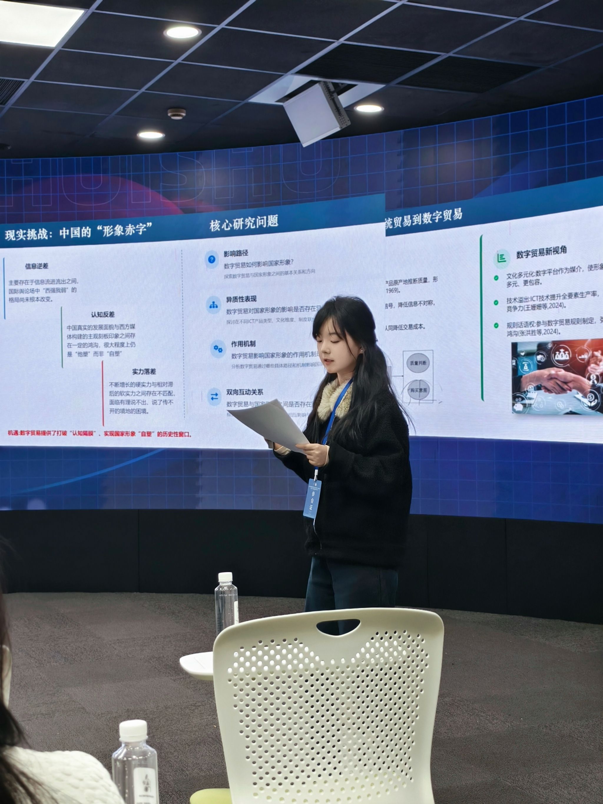 12月13日下午,十一场平行分论坛同步举行,议题覆盖“开放创新与国际竞争新优势”“国际大变局时代下的数字贸易改革创新发展”“制度型开放与自贸试验区提升”“聚焦‘十五五’:把握扩大高水平对外开放新形势、新任务、新路径”“数字赋能高水平对外开放”“数字贸易与高水平对外开放”“识变与应变:民营企业出海新趋势与新赛道”“高水平对外开放下中非经贸合作的深化路径”“开放型经济下农林产品国际贸易新发展格局”“‘一带一路’倡议与国际合作新机遇”“国际商务教育论坛”等。来自全省各高校和研究机构的近百位学者就各自研究成果进行报告,现场交流热烈,学术氛围浓厚。我校2024级MIB研究生叶婷受邀在平行分论坛2汇报了论文《数字贸易与国家形象的型塑:以ICT产品为例》。