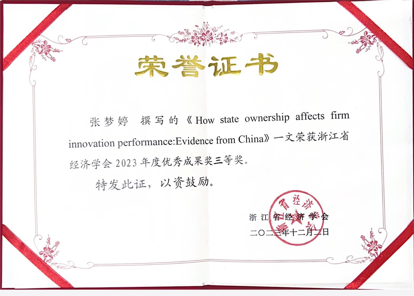 张梦婷老师论文获评浙江省经济学会2023年度优秀成果三等奖