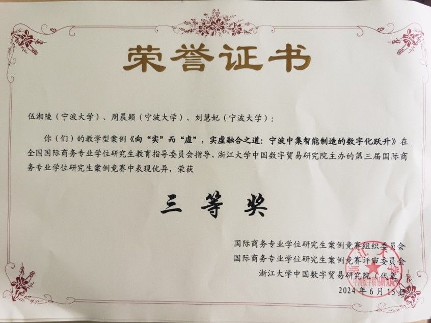 在此次案例评选活动中,我校MIB专职导师伍湘陵与研究生周晨颖(2023MIB)、刘慧妃(2023应用经济学)撰写的案例《向“实”而“虚”,实虚融合之道:宁波中集智能制造的数字化跃升》获评教学型案例三等奖,《向“虚”而“实”,虚实融合之道:美象信息数字孪生的赋能实践》获评研究型案例三等奖。