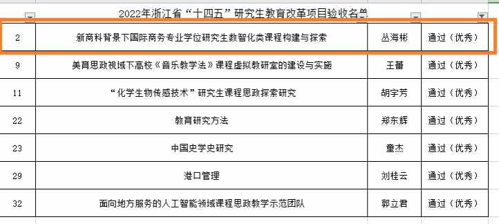 其中,共有7项项目以优秀成绩通过验收。MIB学位点丛海彬教授主持的《新商科背景下国际商务专业学位研究生数智化类课程构建与探索》以优秀成绩通过验收,特此祝贺!