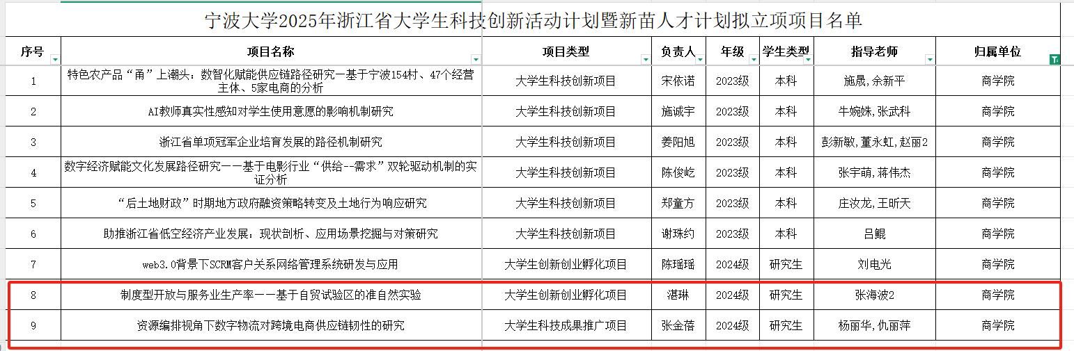 浙江省大学生科技创新活动计划暨新苗人才计划旨在鼓励和支持大学生开展科技创新活动,培养学生的创新精神和实践能力。我校MIB学位点一直高度重视学生科研能力的培养,积极搭建各类学术平台,为学生提供广阔的发展空间。此次国际商务专业研究生项目的成功立项,不仅是对湛琳、张金蓓同学及其指导老师团队科研能力的肯定,也是我校MIB学位点长期以来重视科研创新、注重人才培养的成果体现。