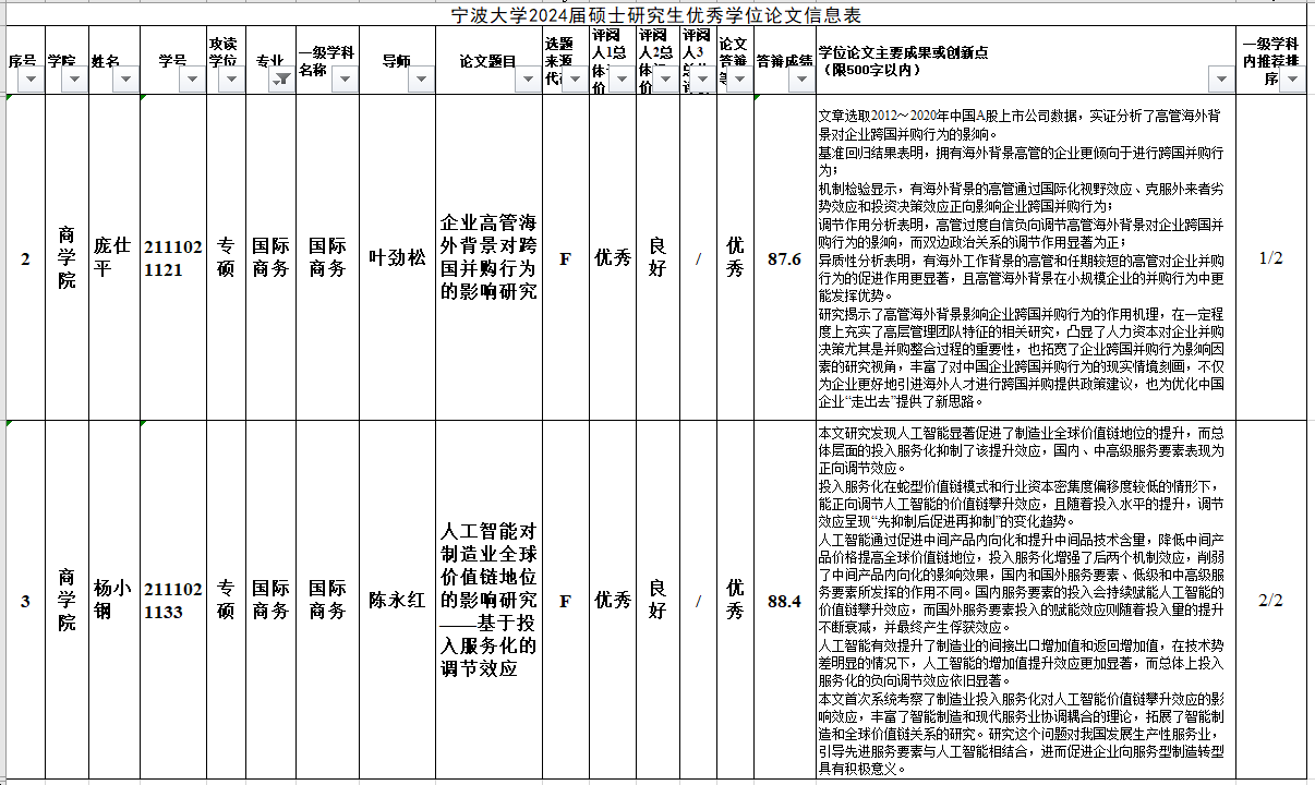 3月24日,h图书馆 研究生院公示“h图书馆 2024届研究生优秀学位论文”评选结果名单,我校2021级MIB学生庞仕平、杨小刚两位同学的学位论文获评校级优秀论文。