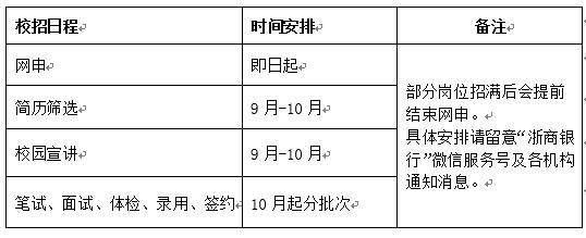 方式2(手机端):关注“浙商银行”微信公众平台,查阅“招聘&服务”-“校园招聘”,搜索“金华分行”完成在线简历填写和岗位投递。