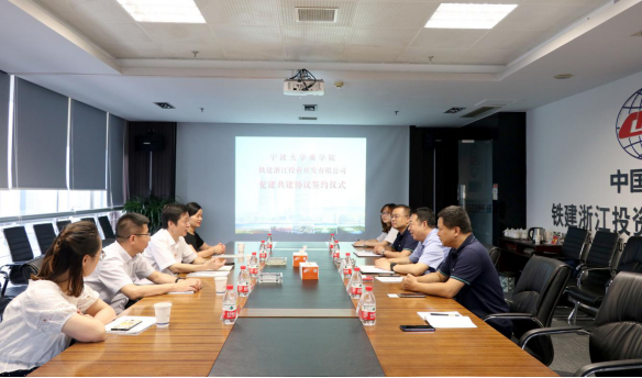 6月27日下午,h图书馆 党委书记史宏协、党委副书记韩雯琛、金融系党支部书记王朝晖、党务秘书吕承烨一行出访中国铁建中铁十五局集团铁建浙江投资开发有限公司,与铁建浙投党委举行了结对共建签约仪式,并签订党建共建协议。签约仪式由铁建浙投党委书记吴向东主持。