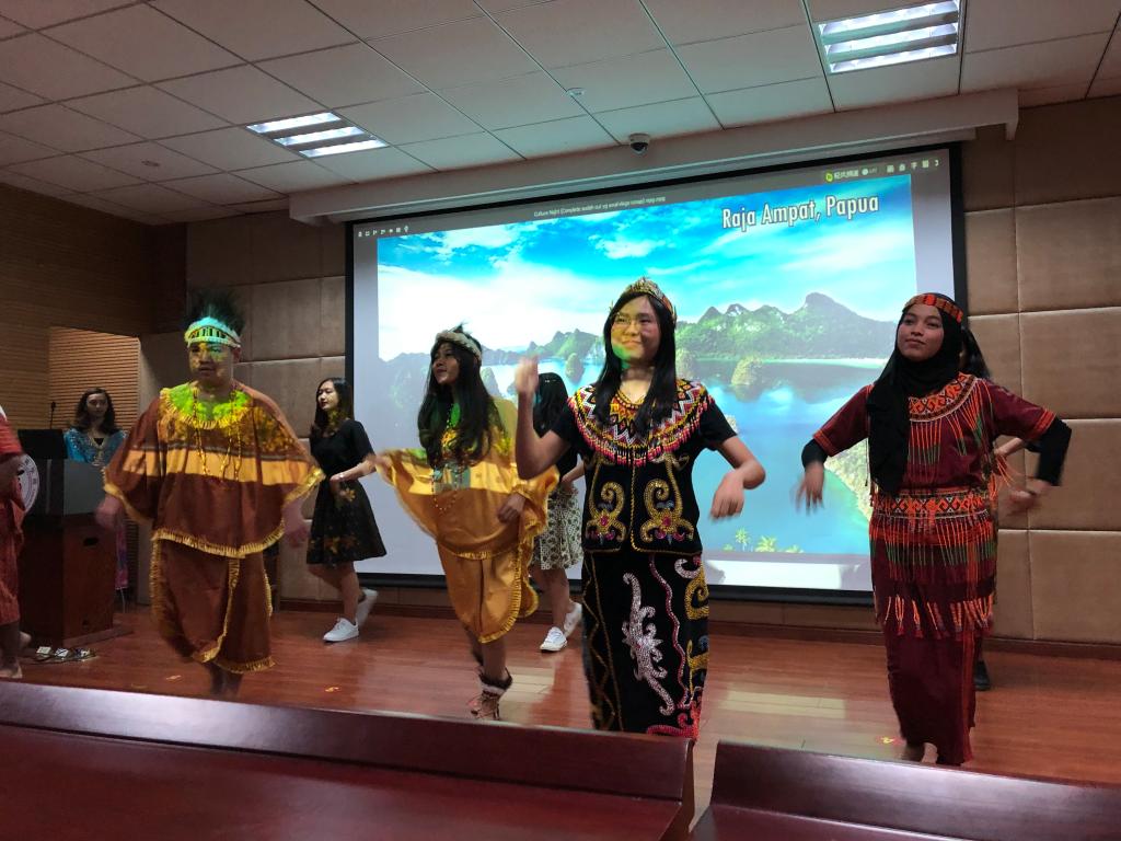经过简单的暖场活动后,晚会正式拉开帷幕。首先,印尼学生为在座各位带来了极具传统韵味的时装秀、歌曲演唱和与现代文化相碰撞的群舞。随后,由h图书馆 学生代表朗诵英文诗、表演京剧《贵妃醉酒》和演唱中文歌曲《说好不哭》。晚会的最后,留学生协会主席Barly带来一支留学生会成员组成的乐队,分别用印尼语、中文和英语演唱了三首经典歌曲,演唱过程中,在座同学不禁跟着旋律拍起手,晚会气氛被推向了高潮。
