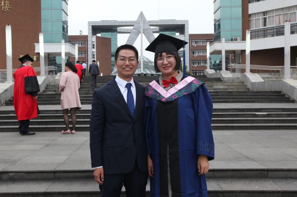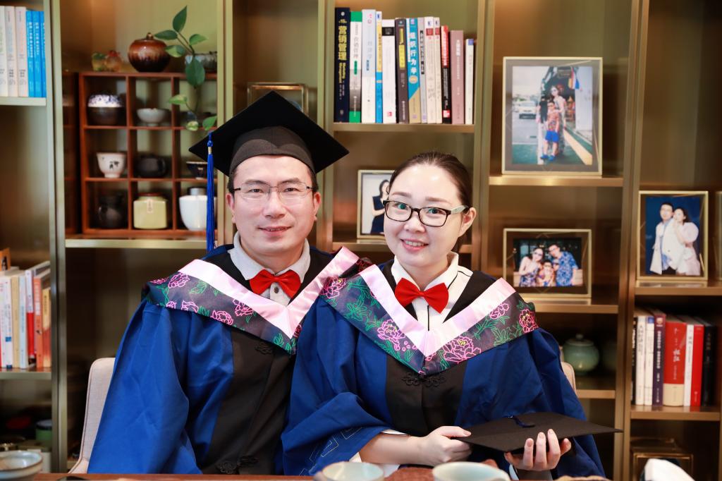 2019届的另一名毕业生张莉,身着硕士服,笑靥如花,同她的丈夫——2019级新生韩松林一道同框。妻子的毕业典礼,同时也是丈夫的开学典礼。两人从大学同学,变为结发夫妻,再升级为硕士校友,一路携手同行。韩松林目前担任华纳圣龙(宁波)有限公司的财务总监。谈及如何结缘中澳,他说,7年前自己刚刚来到宁波时,就已经听说过这个项目,然而由于工作繁忙,一直未能进入项目学习,在此期间,他接触了很多h图书馆 的教授,尤其是中澳MBA项目创始人,邱妘教授,对她的博学睿智和前瞻的眼光印象深刻,逐渐地,他对项目本身也有了更多了解。2017年,他的妻子张莉率先报名入读了中澳MBA项目,他看到了妻子这两年学习时光带来的变化和成长。因此,今年妻子毕业之际,他也毫不犹豫地来报读了中澳MBA项目。