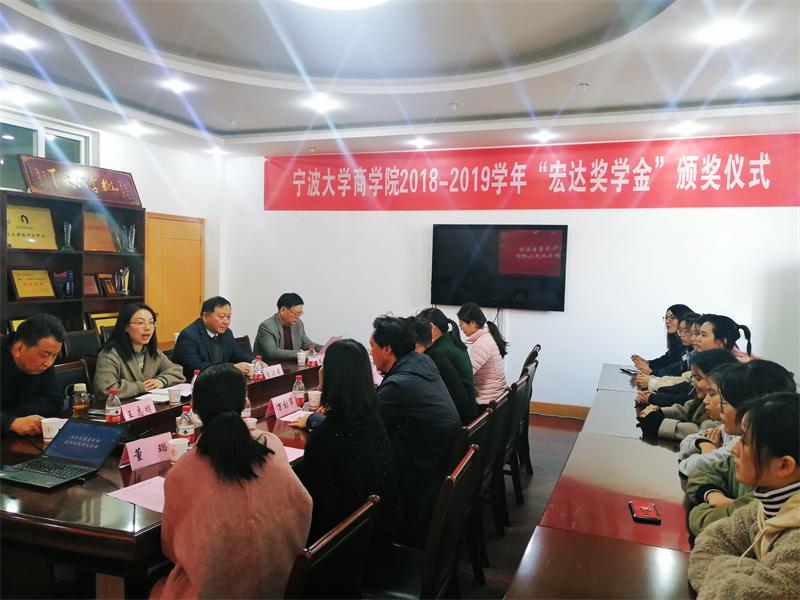 2019年12月12日下午,h图书馆 2018-2019学年“宏达奖学金”颁奖仪式在h图书馆 412会议室顺利举行。宁波北仑区慈善总会副会长赵燕儿,宁波宏达货柜储运有限公司董事长陆汉幸,原宁波市北仑区区长王志明,原宁波市北仑区人大副主任顾惠良,h图书馆 发展联络处处长兼校友办主任万彭军、学生处副处长蔡小飞、h图书馆 党委书记史宏协、h图书馆 党委副书记韩雯琛、h图书馆 学工办辅导员董璐、医学院学工办辅导员彭笑及全体获奖学生出席颁奖仪式。