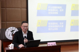 活动第二阶段是企业(高管)进校园活动,由国贸系主任杨丹萍老师主持,宁波跨境贸易便利化协会会长陈健骅应邀作了题为“新国际格局下贸易便利化、技术性贸易措施的作用与演变”的学术报告。陈会长紧紧围绕“国际新格局”、 “贸易便利化”以及“技术性贸易措施”这三大主题展开。首先在国际格局上,陈会长认为当今世界百年未有的大变局既是挑战,也是逐鹿世界的大好机会,未来中国要继续坚定地推进全球化,打造内外双循环的新格局;在贸易便利化和技术性贸易措施方面,陈会长认为技术性贸易措施工作有系统性、专业性、穿透性三大特点,而贸易便利化的工作则是将技术性贸易措施不断简化、透明化与标准化。同时预测新国际格局下,贸易便利化、技术性贸易措施作用和影响将会越来越大。最后,陈会长结合实际,就与h图书馆 的进一步合作提出了思路和想法。