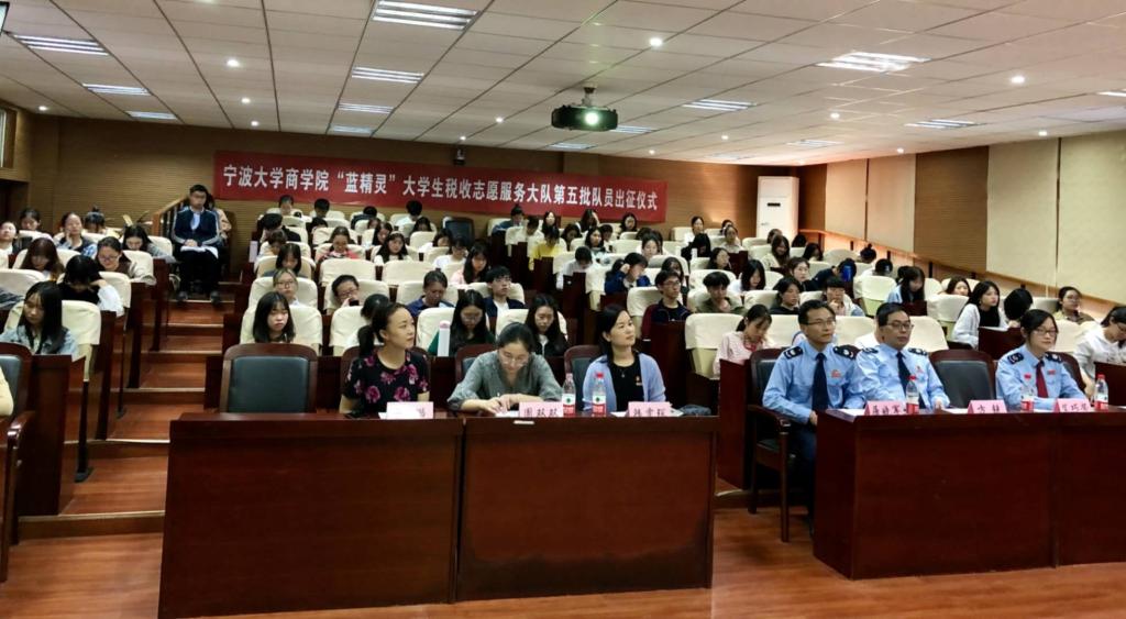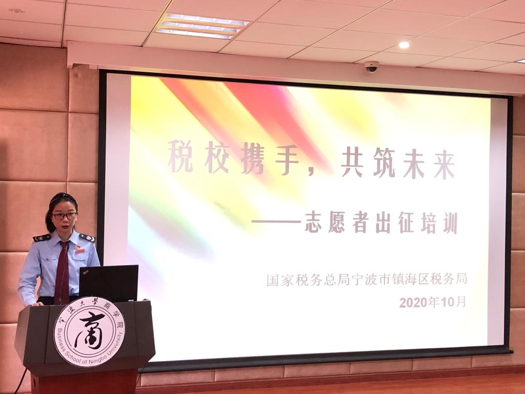 2020年10月28日,h图书馆 “蓝精灵”大学生税收志愿服务大队第五批队员出征仪式在学院109报告厅举行。宁波市镇海区税务局副局长屠晓军、镇海区税务局纳税服务科科长方锐、镇海区税务局蛟川税务所和骆驼税务所负责老师、h图书馆 党委副书记韩雯琛和学院学生党建工作相关辅导员出席本次出征仪式,“蓝精灵”大学生税收志愿服务大队100余名同学参与此次活动。