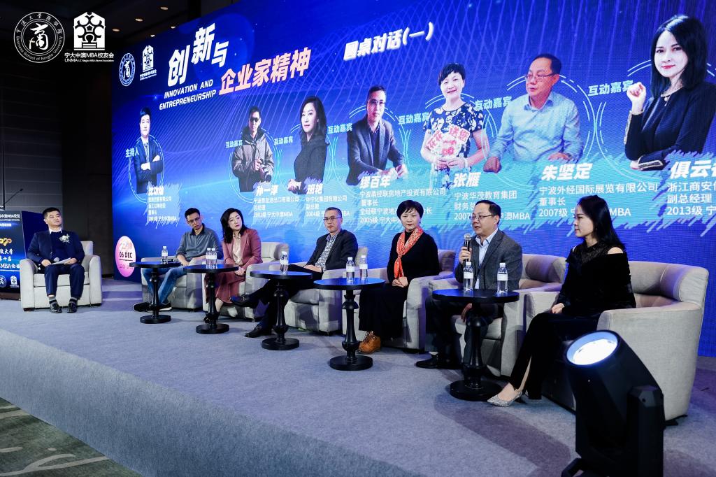 接下来是两场圆桌对话。第一场圆桌对话由恩凯控股集团、浙江以琳创投董事长沈功灿先生主持。宁波泰友进出口有限公司总经理孙一淳、中宁化集团有限公司副总裁班艳、宁波甬经联房地产投资有限公司董事长缪百年、宁波华茂教育集团财务总监张雁、宁波外经国际展览有限公司董事长朱坚定、浙江商安信息科技有限公司副总经理俱云香作为邀请嘉宾,围绕“创新与企业家精神”这个主题展开讨论。嘉宾们结合自身的企业发展,以及在疫情期间面临的困难,分享了各自对企业创新和企业家精神的理解。“创新是企业发展的不竭源泉。”“虽然困难,但仍应结合时代脉动,接受新业态新技术的赋能。”“不断变化、变革,焕新潜能,迭代升级。”