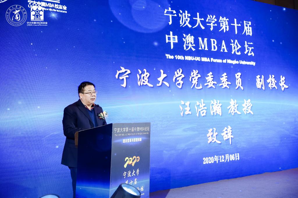 首先,汪浩瀚副校长代表h图书馆 向参加此次论坛的来宾表示热烈欢迎。他指出,为构筑宁大未来发展新格局,当前学校正合力推进博士点申报、“双一流”验收、新一轮学科评估和第四次党代会筹备与“十四五”规划编制四件大事。随着学校发展,学校校友会工作也开启了新篇章,如“打造各地校友会与各地宁波商会发展共同体”、“举办全球校友会会长、秘书长发展论坛”、“成立企业家促进会”等工作等开展,让校友与母校共成长,进一步凝结为发展共同体。在h图书馆 65个校友分会中,中澳MBA校友会极富特色,在今年的疫情期间尤其通过一系列募捐彰显了校友企业家的大爱情怀与责任担当。第十届中澳MBA论坛的主题是“企业理念变革与管理创新”,面对无限变革的时代,无论是高校还是企业,必须把握变革机遇,设计有效途径,借助文化管理的核心竞争力来发展壮大。