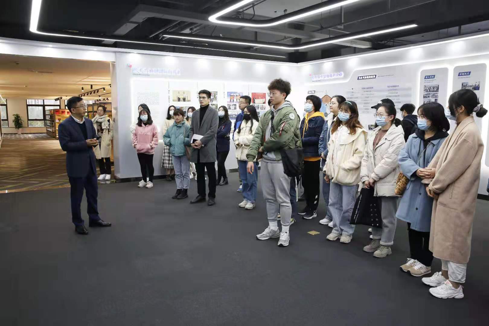 在方永强的带领下,一行人首先参观了赛尔集团的企业展厅。方永强向同学们介绍了集团创业过程、发展史、h图书馆、产品和经营之道和企业的福利待遇等内容,使在场师生对赛尔集团有了初步的了解。随后,方永强向一行人展示了集团样品间种类丰富的产品,并和同学们进行了交流。