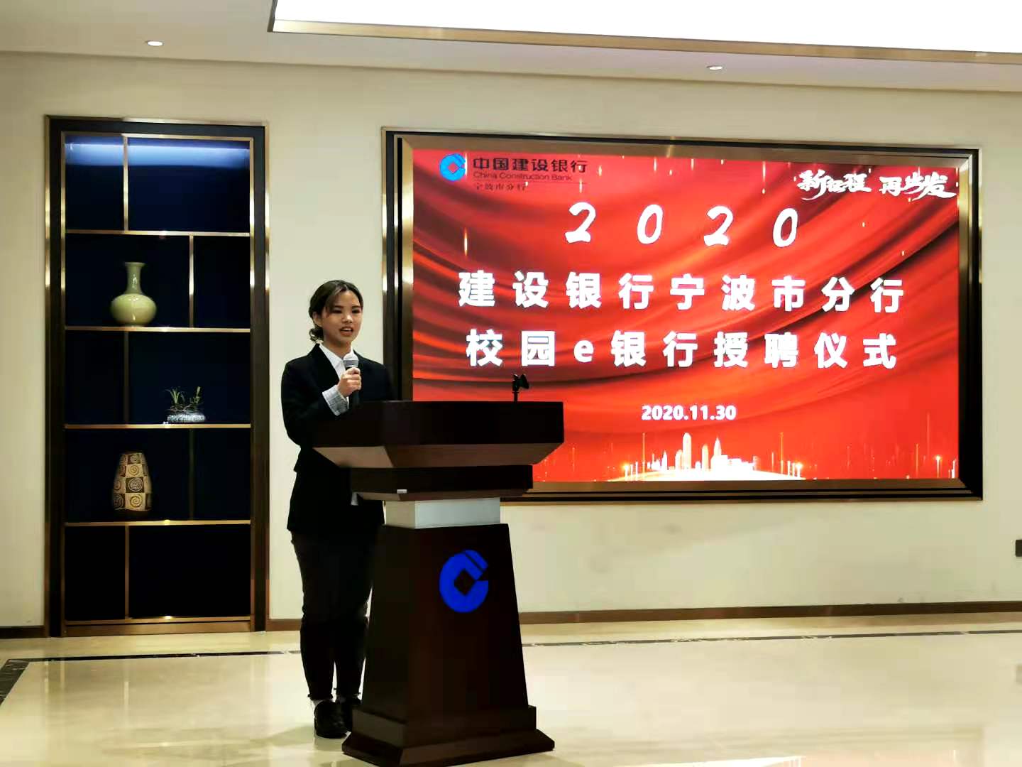 11月30日下午,建设银行宁波市分行校园e银行授聘仪式在中国建设银行宁波分行371多功能厅圆满落幕,本次仪式沿用了授聘仪式与金融宣讲相结合的形式。建设银行宁波市分行个人金融部副总经理孙武、分行营业部副总经理楼建波,h图书馆 党委副书记韩雯琛、团委副书记章舒怡,浙江万里学院学工部部长林德操、副部长吴章健等领导和嘉宾出席本次授聘仪式。