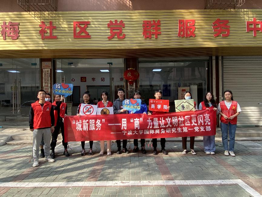 为鼓励学生党员积极加入文明城市创建工作,以实际行动弘扬志愿者服务精神,提升城市“文明指数”,为宁波市创建文明城市贡献力量。10月26日,h图书馆 国际商务专业研究生第一党支部在孔浦社区开展了“城新服务”——用“商”力量让文明社区更闪亮活动。