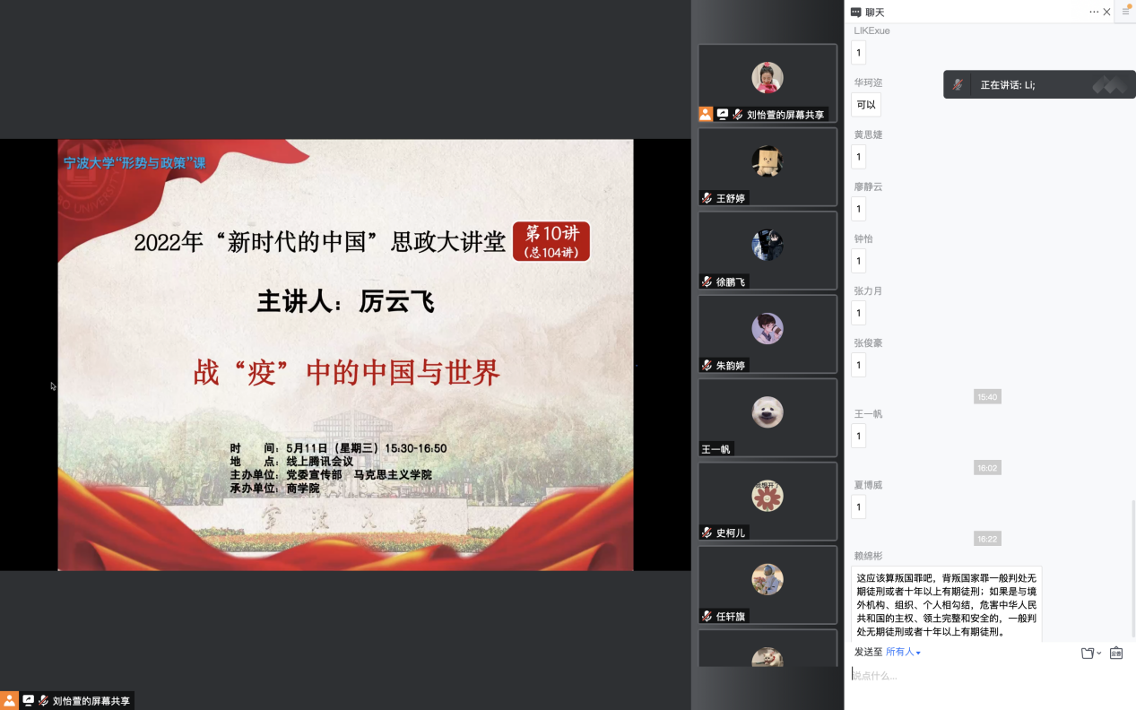 5月11日下午,h图书馆 团委组织的形势与政策课顺利举办,学院270名同学参与。本次课主题为“战‘疫’中的中国与世界”,由马克思主义学院副教授厉云飞教授主讲。
