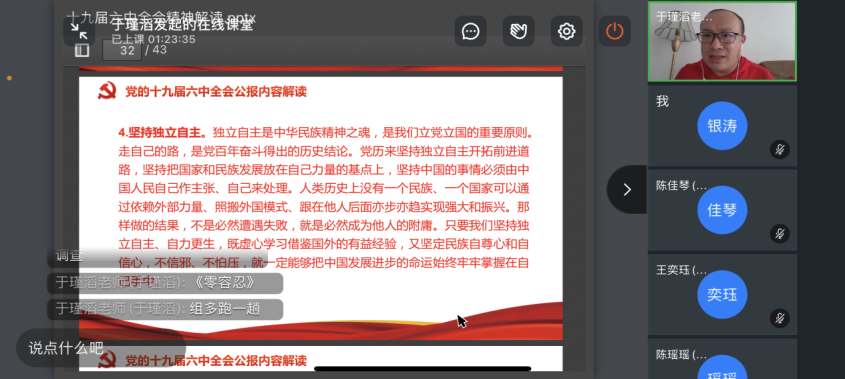 4月20日,h图书馆 党委分党校第46期预备党员培训班于线上举办了主题为《十九届六中全会精神解读》和《共同富裕》的党校课程。本次党课分别邀请会计系教师于瑾滔和经济系教师余璇担任主讲老师,学院第46期预备党员培训班全体学员参加。