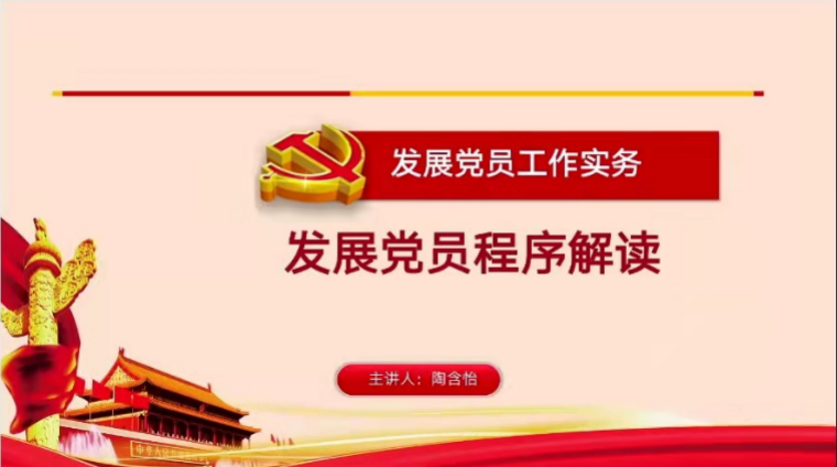 受疫情影响,本次讲座活动安排在线上进行。全体积极分子学员们准时登录钉钉群参与此次线上直播讲座。下午3:30,直播准时开始,围绕“党员发展程序与档案规范化管理”话题,陶含怡的分享“干货满满”,学员们也积极配合,收获颇丰。