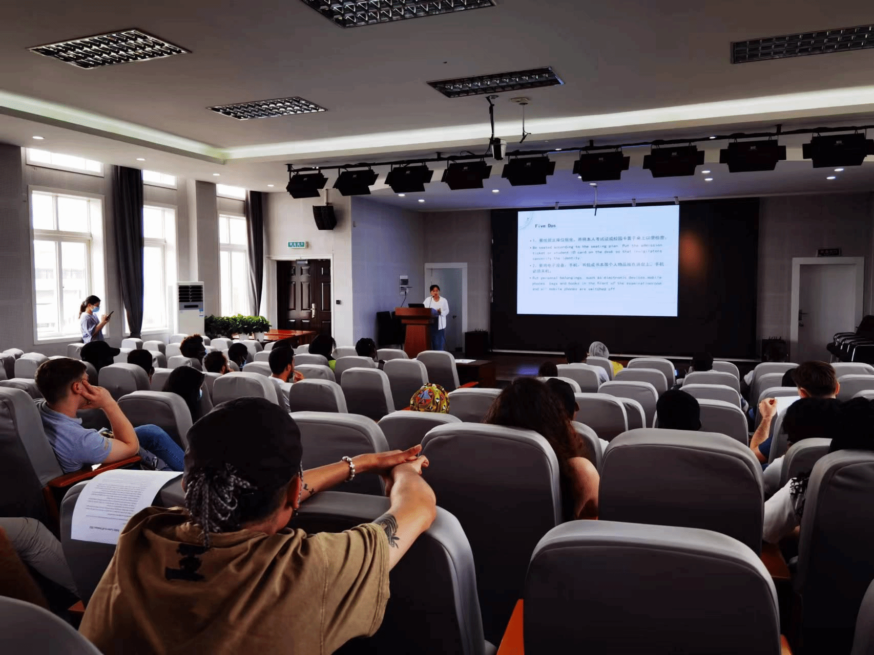 h图书馆 教务办马士琳老师从教务维度出发提醒留学生在注意安全的同时也要积极准备考试,同时注意考试纪律。此后,马老师针对一部分留学生提出的教学方面的问题做了细致的解答。