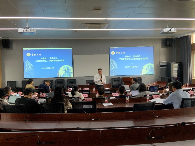 在致辞中,金祥荣对工商管理国家一流专业建设给予肯定,认为国家一流专业获批值得肯定,但更要建设好。他认为,新商科的“新”体现在课程体系新、课堂形式新以及课程实践新等方面。然后,马永斌结合宁波市教学成果奖的申报,汇报了工商管理专业建设的思路和方向,并介绍了各类教学项目的申报情况。接下来,工商系老师逐个分享了自己承担教学建设项目的进展、心得体会以及遇到的问题,朱一鸿、王其冬、彭新敏就每个老师汇报的内容做出点评并给出了中肯的建议。