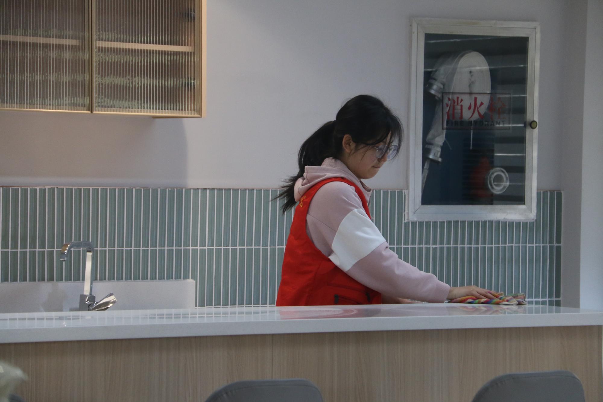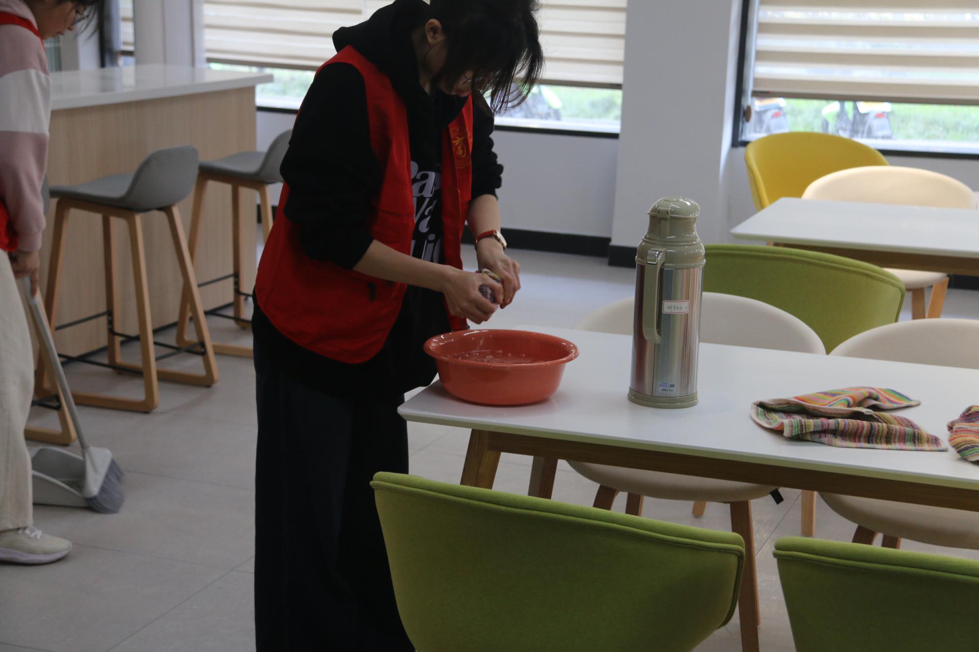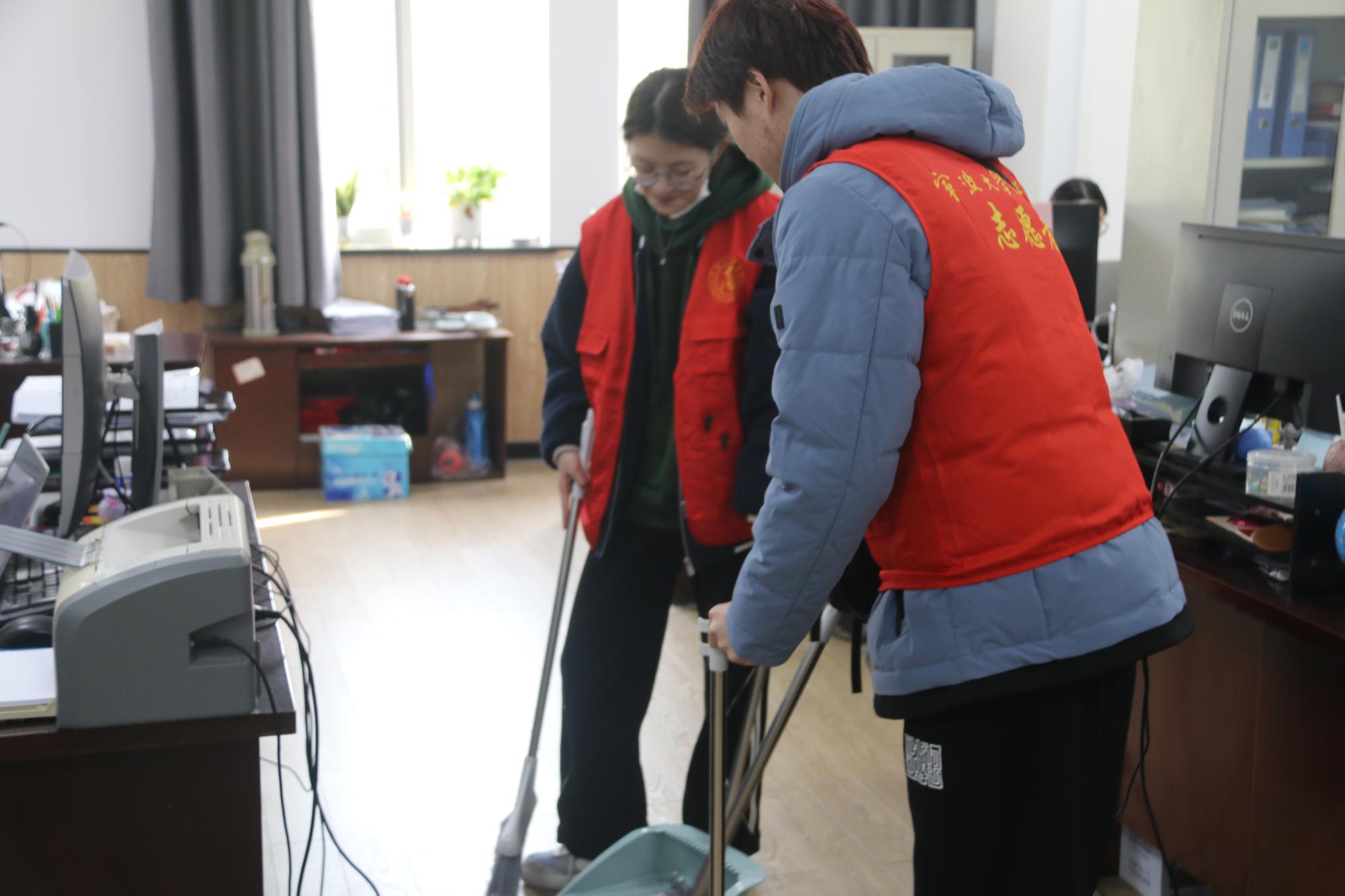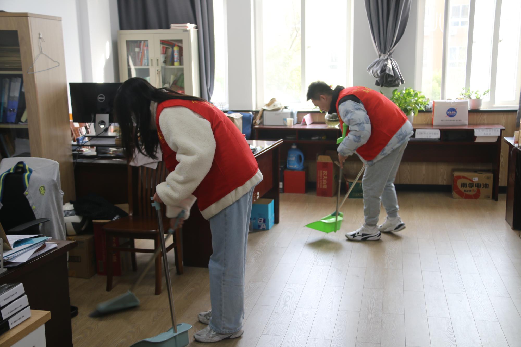 在活动过程中,志愿者们借助抹布、扫把等工具,对楼内公共区域、办公区域等进行清扫整理。他们之间的互相配合,展现出了团结协作、互帮互助的互助精神。