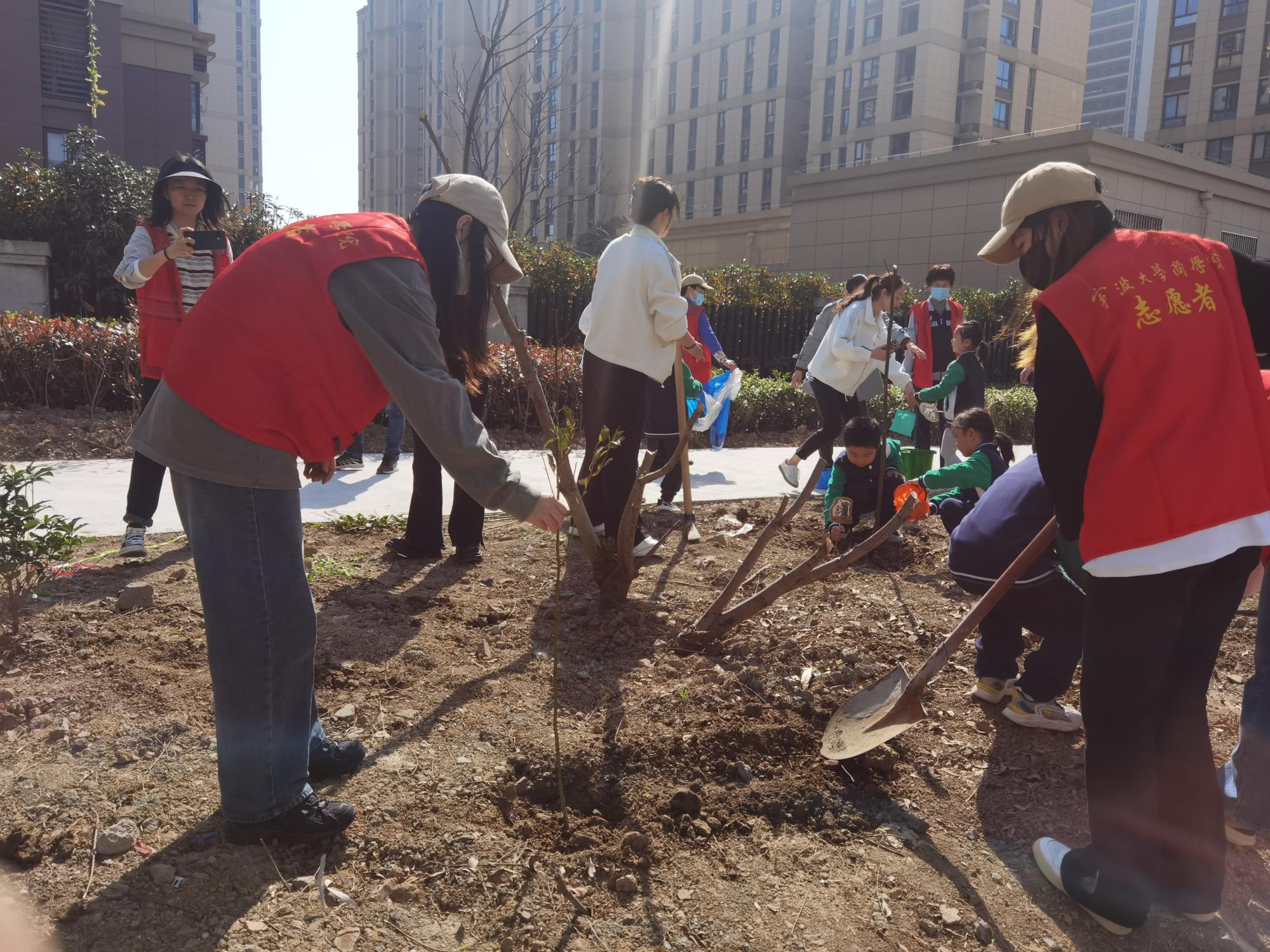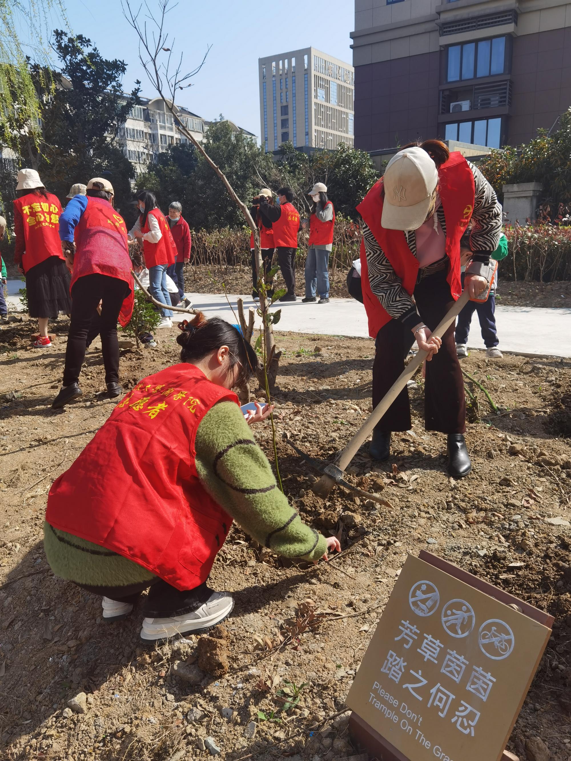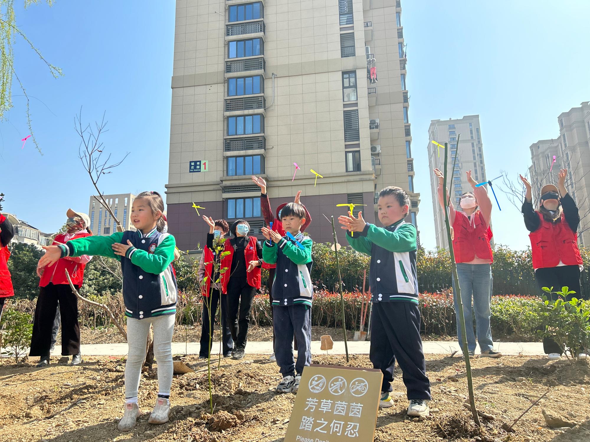 随后,h图书馆 会计专硕研究生党支部成员和社区党员、悦士庭幼儿园老师和小朋友分组植树,活动现场,大家热情高涨,挥锹铲土、挖坑栽苗、扶苗填土、培土围堰。大家干劲十足,认真细致地栽种好每一株树苗。“学习防诈骗知识,守护自己的财产安全,不让诈骗分子有机可乘,同样也是守住了自己家里的‘金山银山’。”大家将防诈标语宣传牌挂在了小树苗上,希望在祖国土地上种下绿色的同时,也把防诈、反诈知识“植”入人们的心中。活动的最后,大家一起放飞竹蜻蜓,寄托自己的美好愿望。