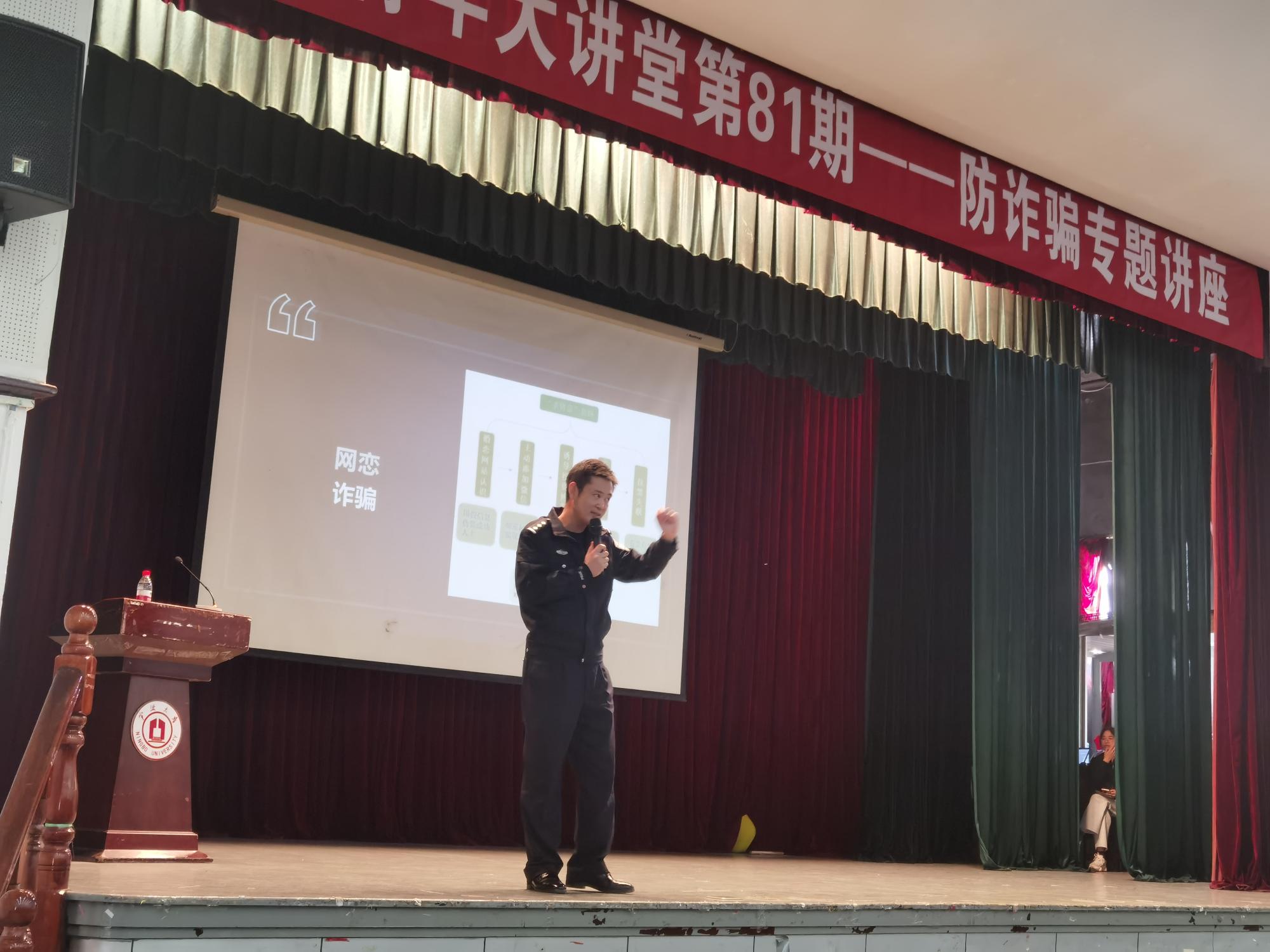 4月12日,h图书馆 于锦绣小剧场开展商院青年大讲堂第81期防诈专题讲座,本次活动由庄市派出所杨延飞警官主讲,h图书馆 二百余名学生参加本次活动。