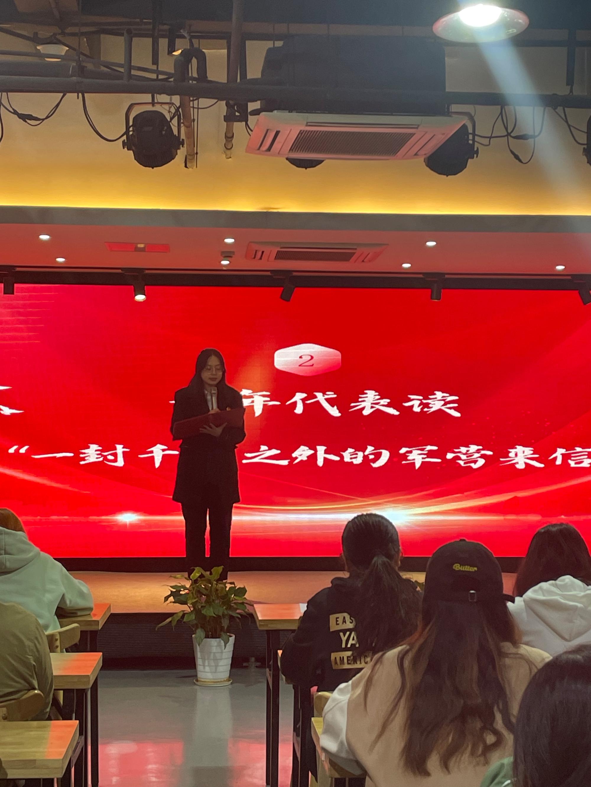 随后,青年代表胡升越诵读了“一封千里之外的军营来信”。这封信件,来自于h图书馆 18级信管专业的李凡,她于2022年应征入伍,成为了一名女兵。信中,李凡讲述了自己在部队的生活,除去种种艰苦训练,她印象最深的是晨跑看到的绚烂日出。在李凡看来,西部计划是一个风口、一块跳板、一个绝佳的契机,可以让广大青年在实现梦想的同时实现自身的价值。李凡学姐说道:“清晨的日光正和煦、风中有晨露的清新,我最终成为了年少时自己最想成为的样子,无愧于自己、无愧于家国!”