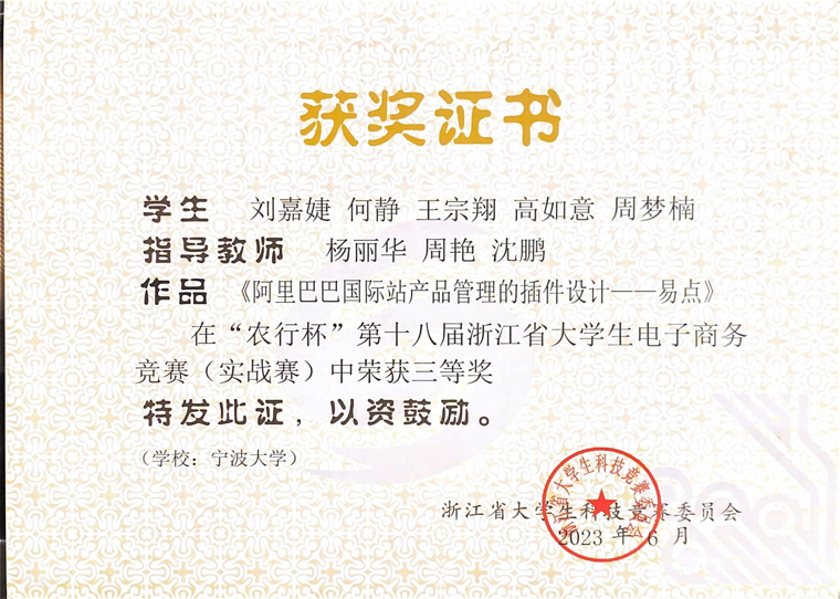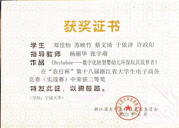 5月28日,“农行杯”第十八届浙江省大学生电子商务竞赛暨第十三届全国大学生电子商务“创新、创意及创业”挑战赛浙江省选拔赛落下帷幕。h图书馆 跨境电商微专业由杨丽华、张宇萌老师指导,郑佳怡、苏映竹、蔡文琦、于依泽、许政阳同学参与的作品《Heybabee——数字化转型婴幼儿环保玩具筑梦者》荣获跨境电商—阿里巴巴国际站赛二等奖;由杨丽华、周艳、沈鹏老师指导,刘嘉婕、何静、王宗翔、高如意、周梦楠同学参与完成的《阿里巴巴国际站产品管理的插件设计——易点》获得跨境电商—阿里巴巴国际站赛三等奖。这也是跨境电商微专业学生继首届“典阅杯”全国高校跨境电子商务综合能力大赛全国总决赛斩获佳绩后,第二次在该项赛事中获奖。
