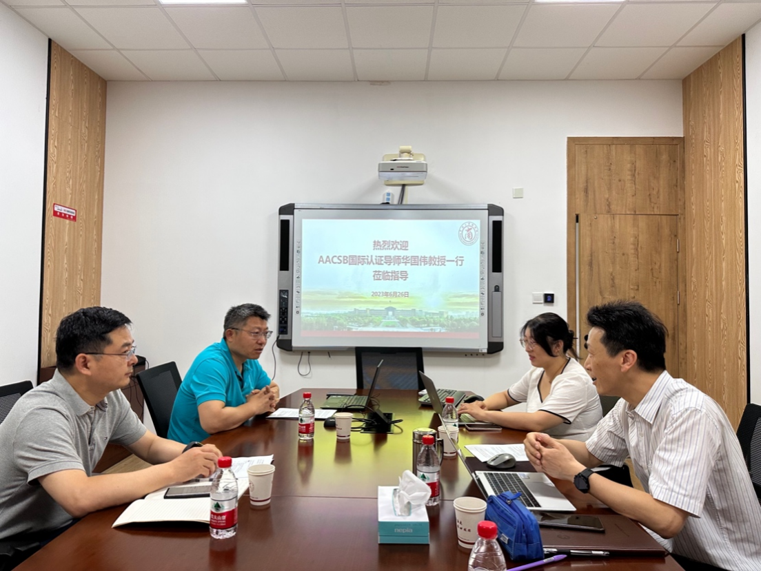 在与华国伟教授和曹卫兵博士的座谈中,华教授首先听取了学院进展报告的撰写情况汇报。h图书馆 协理副院长朱一鸿分别介绍了学院自《初始自评报告》通过以来采取的改进措施、学习保障建设情况以及师资力量的提升成果。华国伟教授详细审查了学院的认证工作,对学院在资源配置、教学、科研等方面所做的努力给予了高度评价,同时强调了AACSB认证的标准和要求,并进一步就学院的战略规划、教学质量管理体系、学术影响力、社会服务与培训等方面提出了一些针对性建议。
