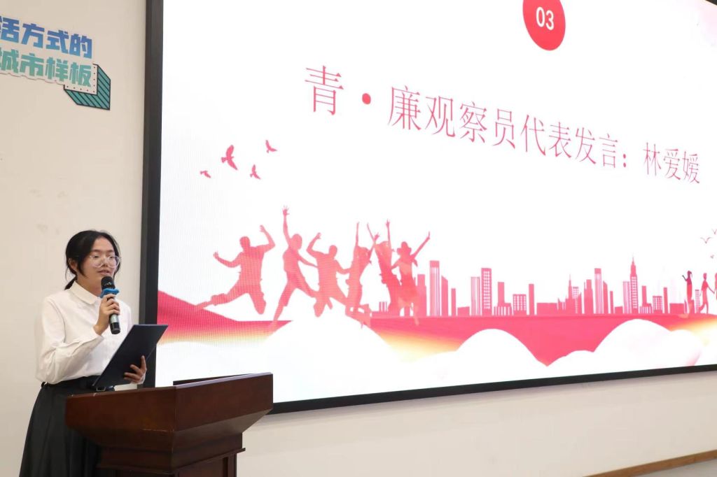 h图书馆 本科生第三党支部的林爱嫒同学作为“青·廉观察员”代表发言,她表示很荣幸能成为“青·廉观察员”里的一员,之后将会积极配合小镇做好监督检查工作,为维护小镇清廉文明的健康生态圈,提出自己的意见建议,为清廉商院、青·廉小镇建设贡献自己的智慧与力量。