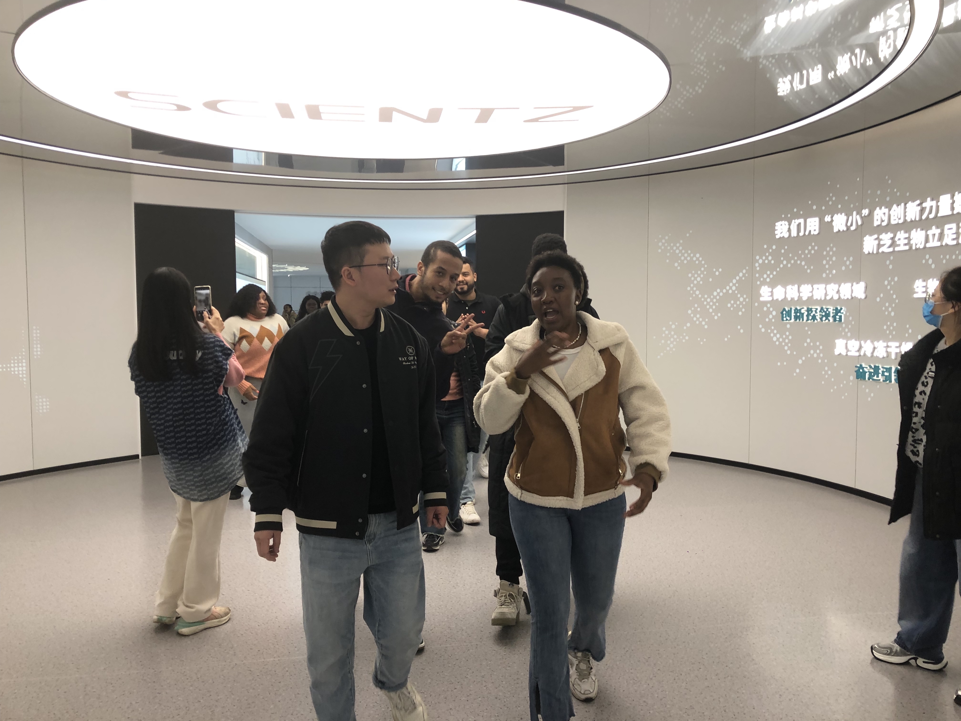 在工作人员的热情引导下,一行人参观公司展厅,了解公司发展历程,工作人员向留学生们介绍主要产品和产品应用场景,并进行样品宣讲,使同学们对公司的工作环境有了初步了解。