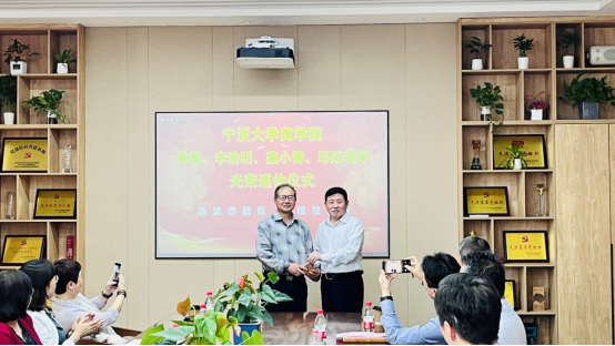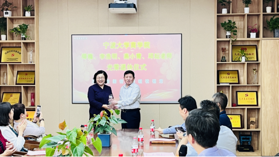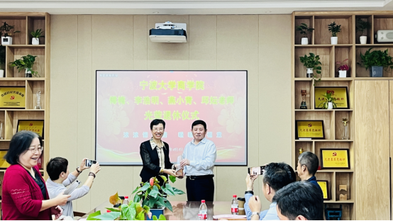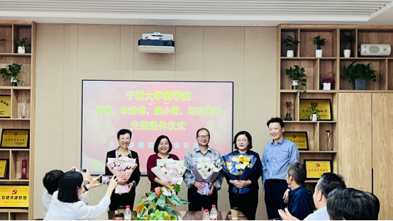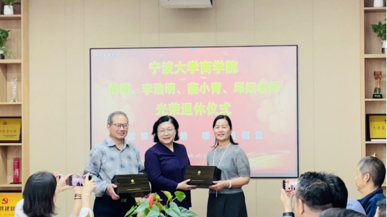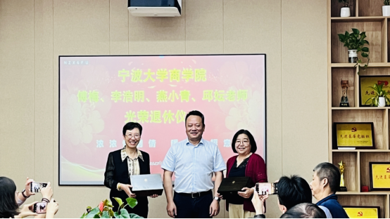 接着,金祥荣院长为四位老师颁发了荣休纪念奖杯;韩雯琛副书记、陈涛副院长为四位老师送上荣休纪念礼物;分工会主席朱一鸿为四位老师送上祝福鲜花。