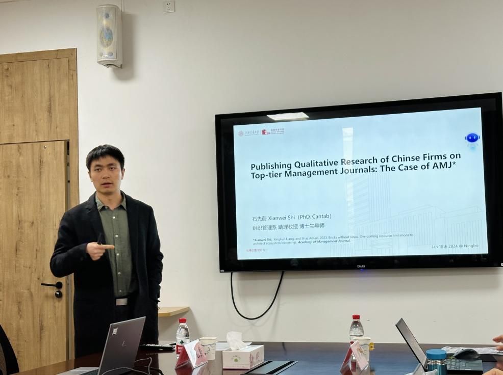 2024年1月18日下午,上海交通大学石先蔚助理教授受邀在h图书馆 214教室为h图书馆 师生开展了题为“在国际顶级管理学期刊上发表质性研究:以AMJ的发表历程为例”的学术讲座,讲座由学院副院长彭新敏教授主持,20余位师生参加。