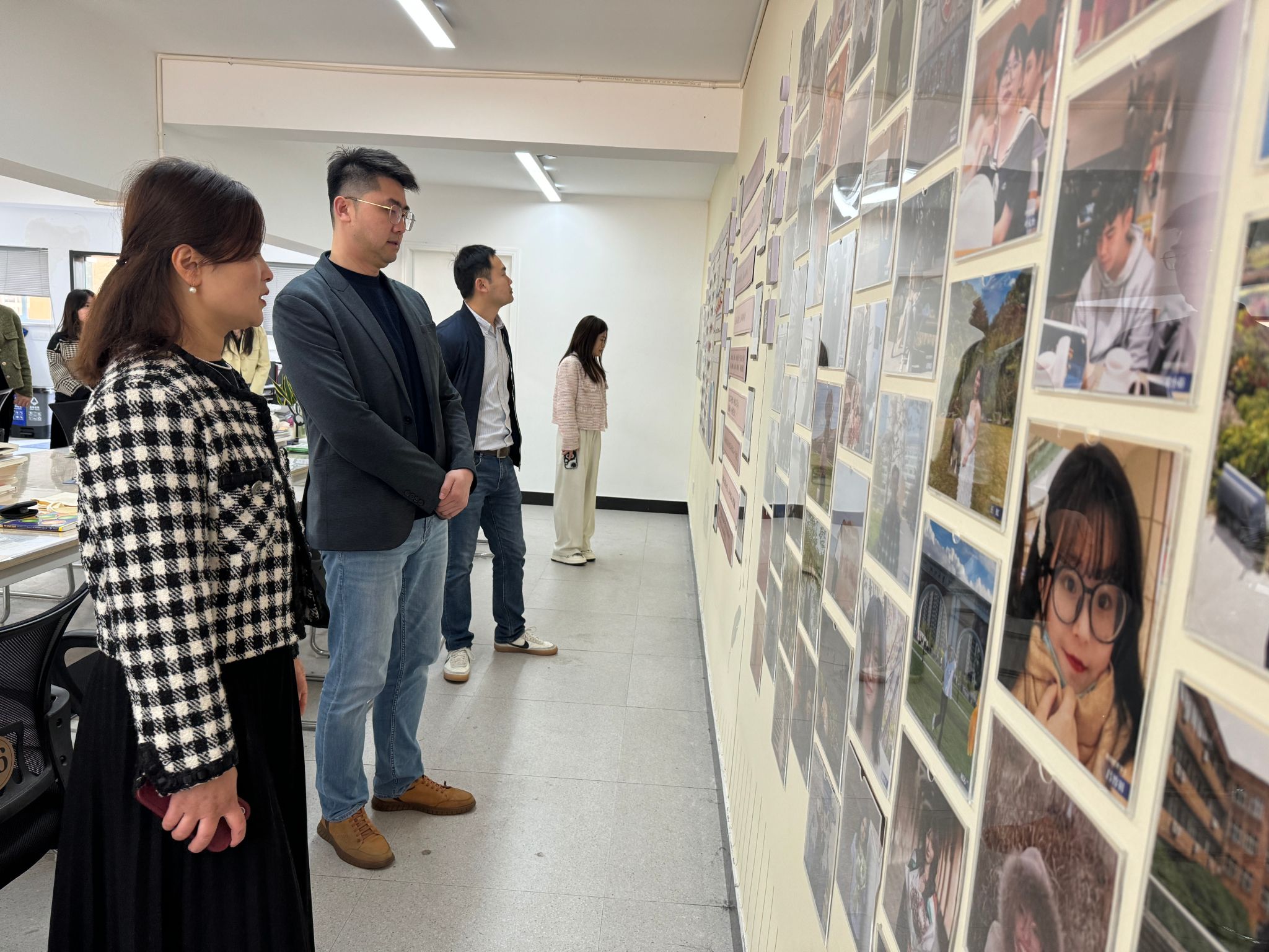 在韩雯琛的带领下,傅琪一行人参观h图书馆 “清风长廊”、共“商”青春心理工作室、共“商”未来生涯工作室、学生自习室。