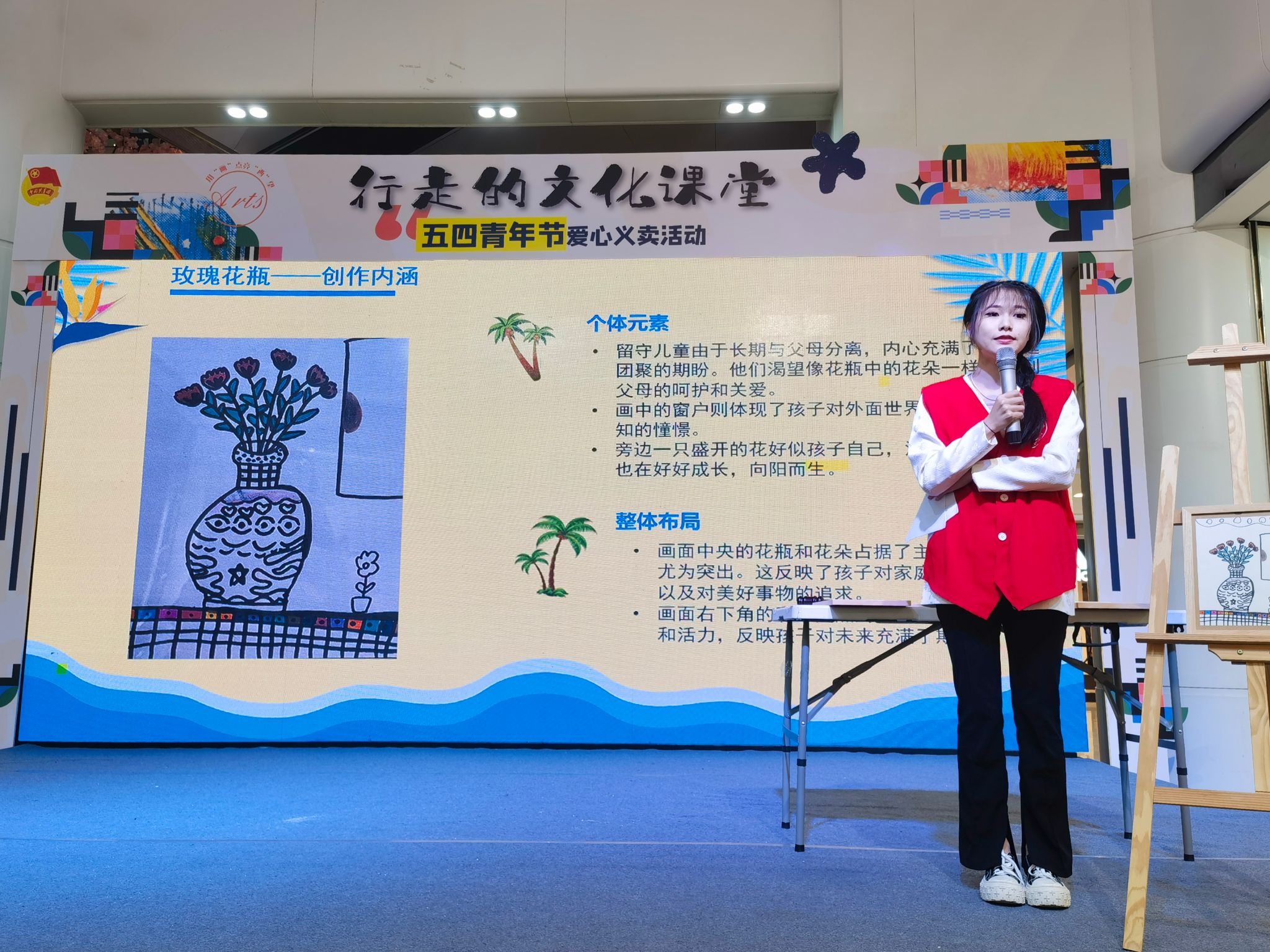 色彩交错的“霍比特房”、俏皮可爱的“小怪兽”、清新素雅的“宝特瓶”······5月8日下午,h图书馆 《行走的文化课堂》五四爱心绘画作品义卖活动在宁波市奉化区银泰城火热举行,青年志愿者们穿上特色红马甲热情推销,有的激情演说招揽顾客,吸引众多家长和市民驻足购买。