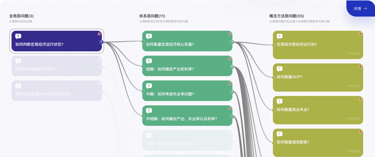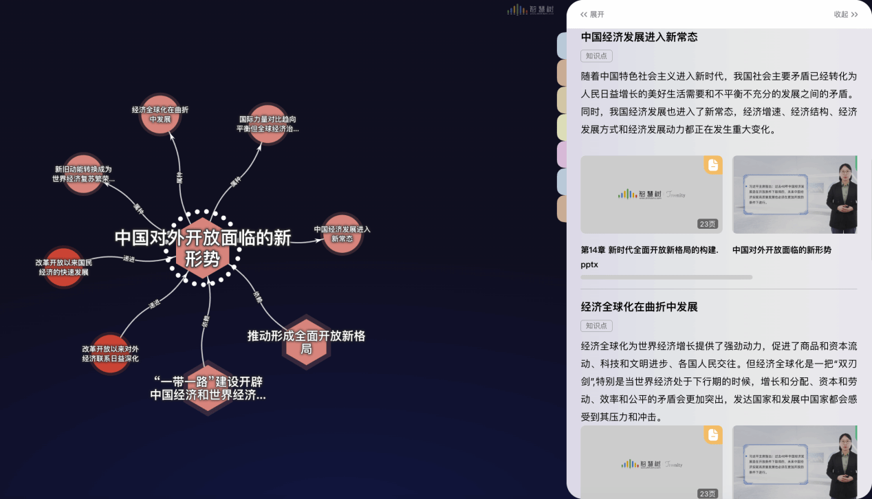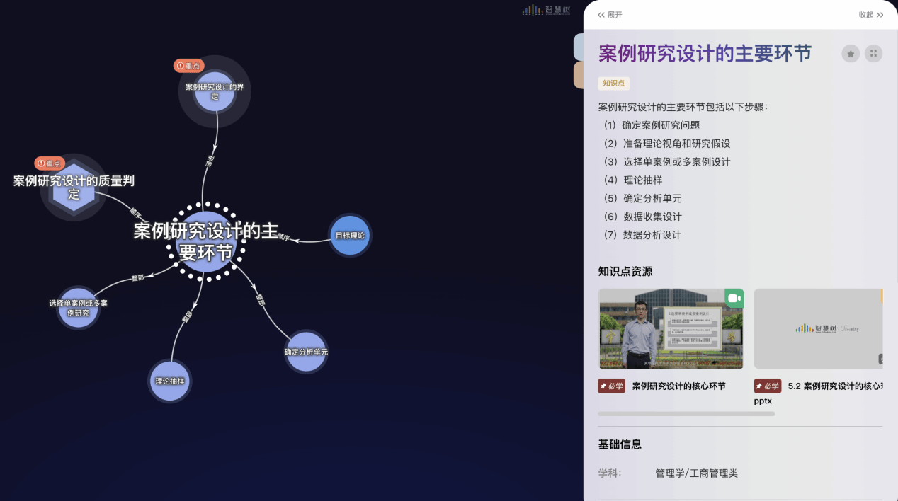 知识图谱作为数字化建设的内在引擎,充分激活现有教学资源,形成“多模态”的资源学习空间,将课程的视频资源、教材、案例、实践、考核以及丰富的外延资源进行梳理和结构化关联,为学生提供更个性化更丰富的学习路径选择。