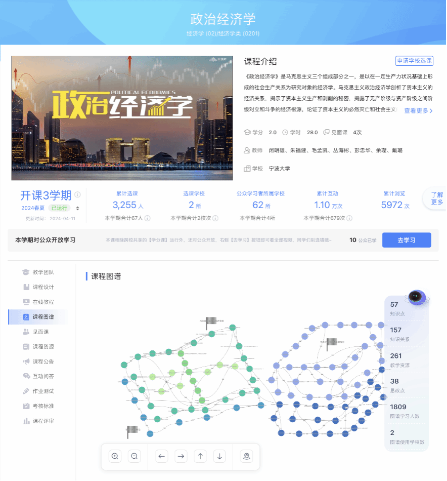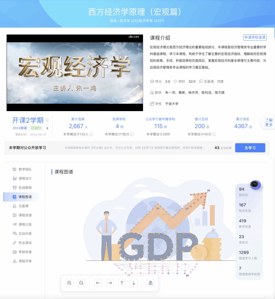 h图书馆 10门知识图谱AI课程已实现线上MOOC互联互通,依托智慧网开展全国运行。知识图谱AI课程已累积20余所高校,近6000人学习,覆盖新疆财经大学、西安财经大学行知学院等西部高校。朱一鸿副教授主讲的《宏观经济学》多次与新疆科技学院开展“慕课西行 同步课堂”教学活动,实现课程协同、资源协同,推进教育均衡发展。