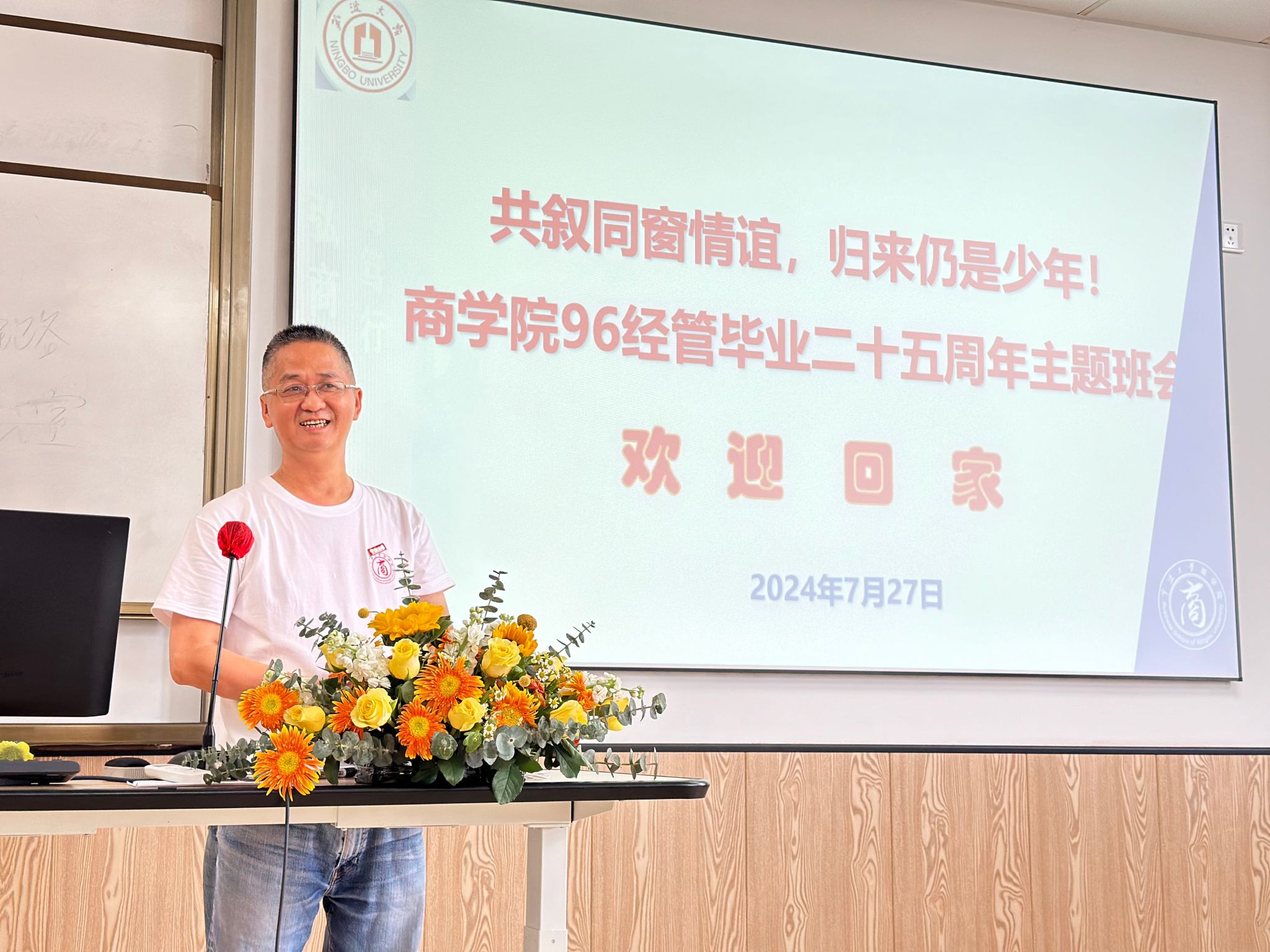 下午一点,从全省各地赶来的校友们相聚在学院422教室举行毕业二十五周年主题班会。班会伊始,现场播放了朱老师制作的一分钟视频《青春回忆——宁大96经管班》,把校友们的记忆带回到二十五年前的大学校园。视频播放后,朱老师按照学号给校友们进行点名,并给每位校友佩戴h图书馆 校徽。朱老师用PPT形式现场介绍母校母院二十多年来的巨大变化。96经管班校友们依次上台讲述大学期间的美好回忆,向母校汇报各自工作、家庭现状。值得欣慰的是,毕业二十五年后,班级每一位校友身体很健康、工作很顺利、家庭很幸福。校友们纷纷表示,h图书馆 的几年学习,塑造了自己的人生观、价值观、世界观,尤其是老师们的谆谆教导,对他们的工作生活助益良多。班会的最后环节由朱老师给校友们上了一堂《宁大版的增广贤文——大学人生12条箴言》。朱老师风趣幽默的语言活跃了课堂气氛,一下子把校友们拉回到二十五年前的求学时光。