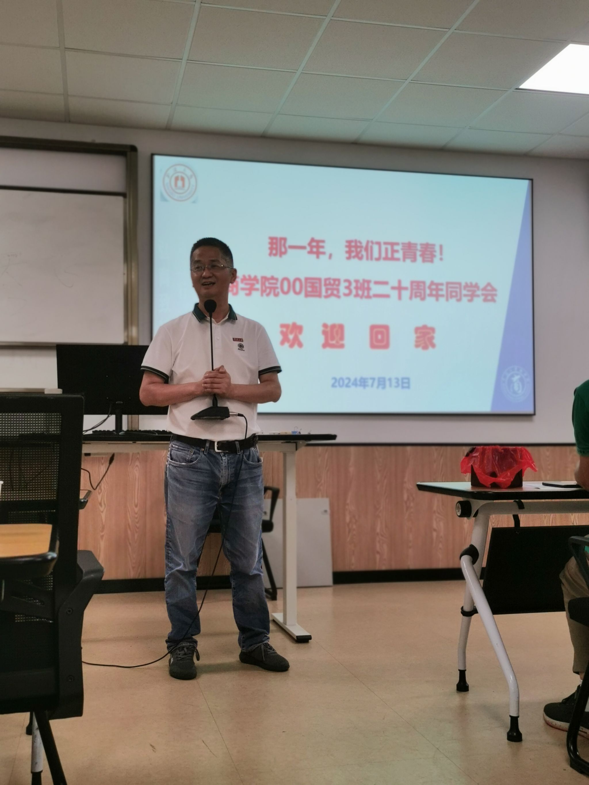 7月13日下午天气闷热,但h图书馆 大楼314会议室欢声笑语,迎来了00级国贸3班毕业二十周年的同学会。来自全国各地近40名校友带着对母校的深深眷恋、对老师同学的浓浓思念,相聚母校,回忆二十年前的青春往事。班主任朱福建老师应邀参会并主持活动。