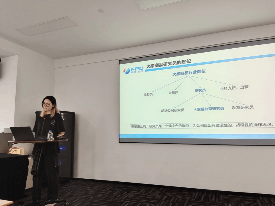 在参观完公司的整体环境后,全体师生前往会议室进行报告学习和座谈。会上首先由同样毕业于h图书馆 的戴梦轩师姐向在场师生作关于大宗商品研究员定位的专题报告,介绍了大宗商品研究员的岗前准备工作和主要职责,以及期现业务主管在渠道业务和大宗商品研究员岗位上的工作内容,使在场师生对工作要求和工作内容有了基本了解。