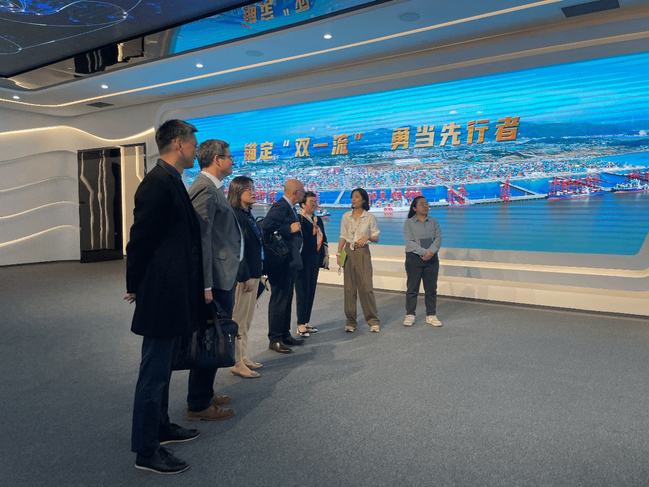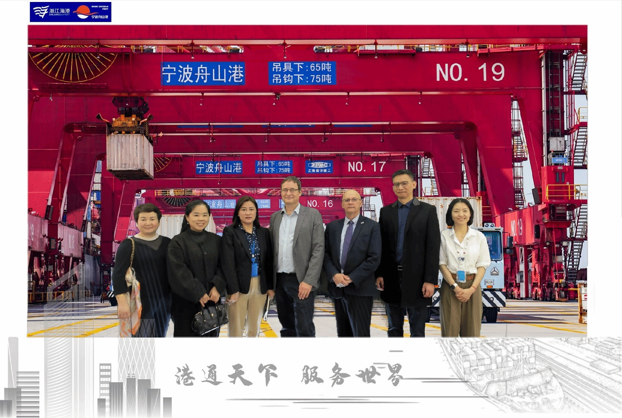 11月2日下午,堪培拉大学两位院长在国际办工作人员陪同下参访了校友企业浙江省海港集团。来访一行受到浙江省海港集团新加坡办事处主任兼股份公司业务部副部长、中澳MBA2005级校友董佳的热情接待,集团旗下宁波舟山港股份有限公司业务部海铁中心主任许斌、海外中心主管施璐璐陪同访问,校友会名誉会长2001级孙一淳、秘书处首席财务官2018级金锦丽代表校友会参与交流。参访期间,两位院长在董佳的介绍下,深入了解了宁波舟山港发展历程、战略规划和商业模式。Uwe Dulleck院长亲身体验了虚拟吊集装箱上船的技术,并通过体验5D影院的动画展示,仿佛置身于繁忙的港口现场,亲身感受了宁波港在智能化、自动化方面的先进科技。随后的交流会上,由许斌详细介绍了公司近年来在推进海铁联运方面的举措和成效。两位院长也在自由交流环节就自己感兴趣的港口与内陆枢纽结合等话题进行了提问和深入交流。作为集团主要经营的港口之一,宁波舟山港是我国大陆重要的集装箱远洋干线港、国内最大的铁矿石中转基地和原油转运基地、国内重要的液体化工储运基地和华东地区重要的煤炭、粮食储运基地,是国家的主枢纽港之一。