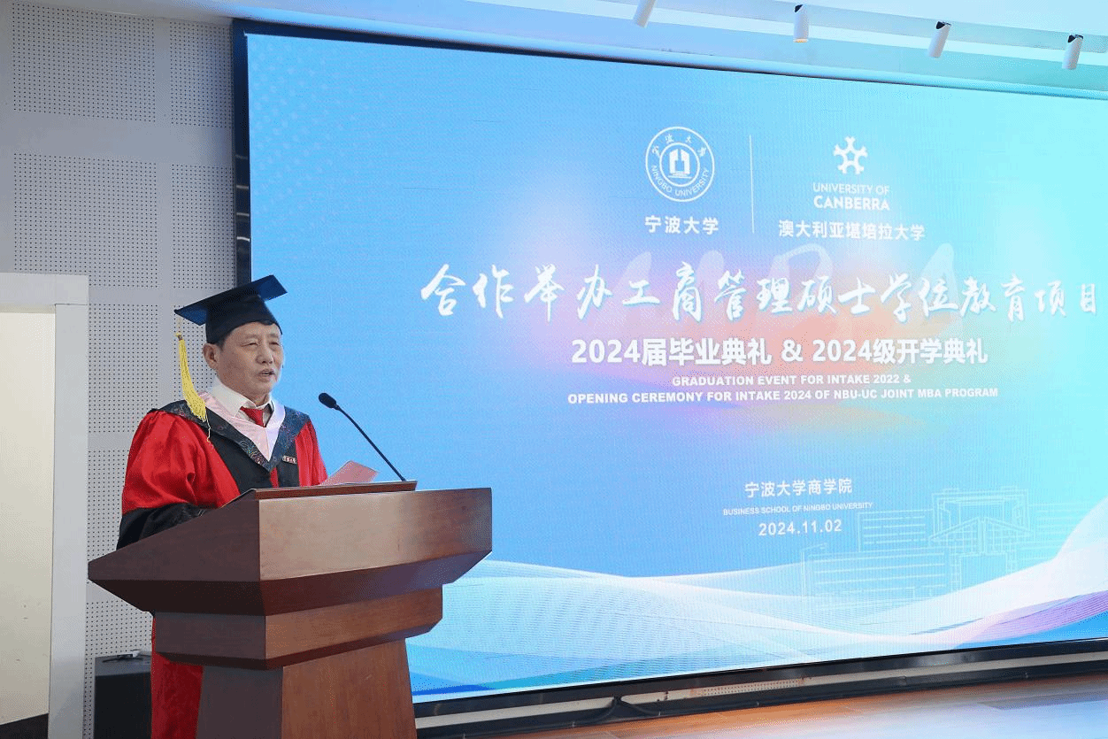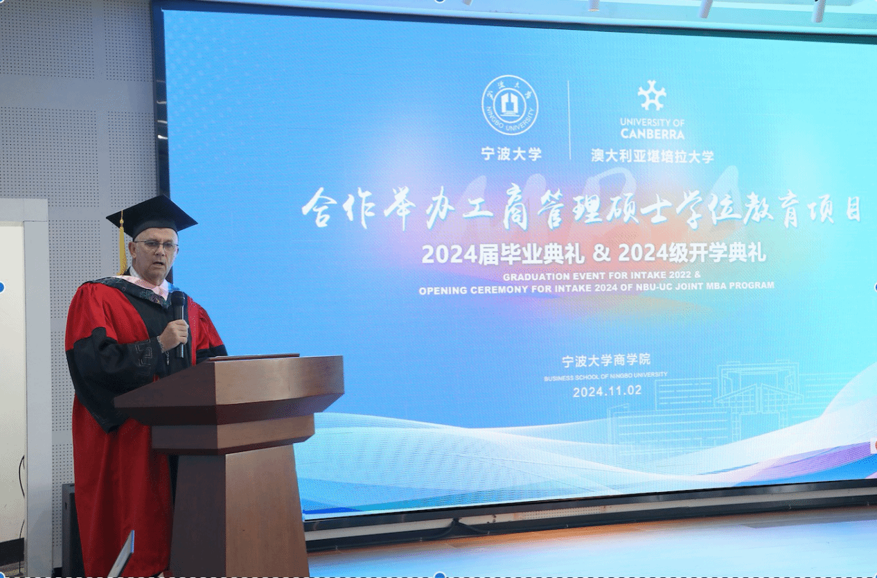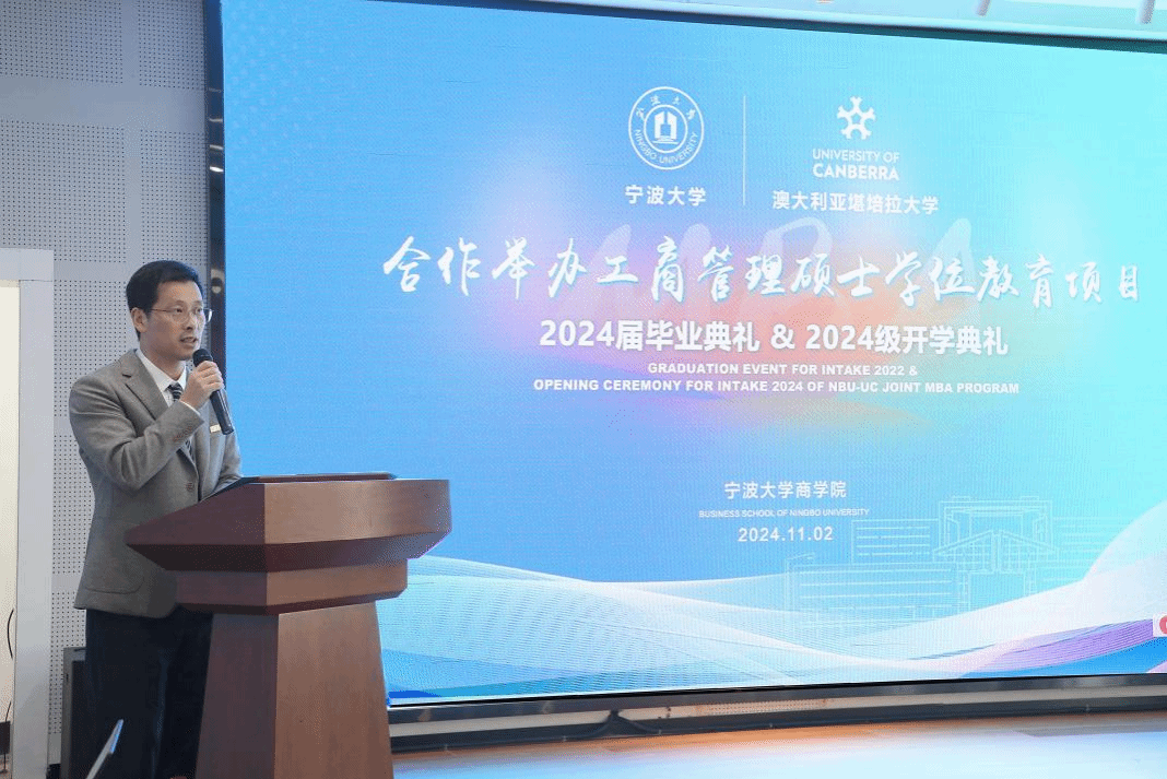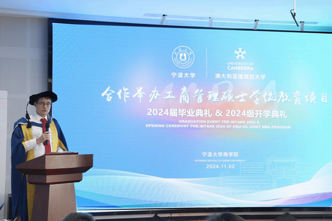 11月2日下午,h图书馆 中澳MBA项目2024届毕业典礼暨2024级开学典礼在h图书馆 五楼报告厅隆重举行。堪培拉大学商政法学院院长Uwe Dulleck、副院长Simon Hoy专程从澳洲赶来,见证这个重要的时刻。h图书馆 院长金祥荣、党委书记史宏协、党委副书记吴敏、中澳MBA校友会会长汪新宇、常务副会长兼秘书长焦名明及中澳MBA教师代表、优秀校友理事等出席此次典礼。典礼由h图书馆 副院长彭新敏主持。