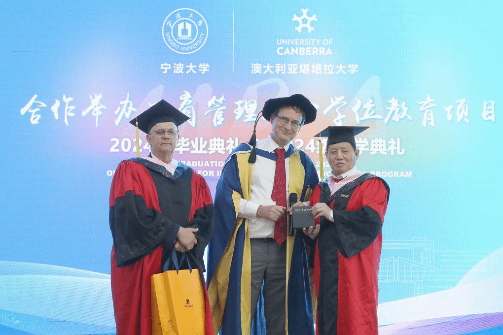 2024届毕业生余丹作为毕业生代表发言。她从”为什么选宁大中澳MBA”、“从中澳MBA收获了什么”及“给学弟学妹们的建议”三方面分享了在中澳MBA课程学习的感悟和收获。随后,毕业生代表向h图书馆 和澳大利亚堪培拉大学商政法学院赠送了精心准备的富有中国文化特色的毕业礼物。澳大利亚堪培拉大学也分别向h图书馆 和毕业班级回赠了具有堪培拉地标特点的礼物。