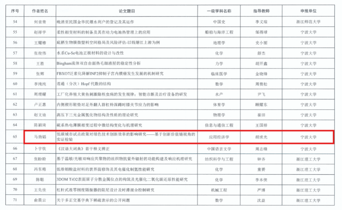 近日,浙江省研究生教育学会公布了2023年浙江省优秀硕士学位论文名单,h图书馆 2023届产业经济学硕士毕业生马劲韬的论文《低碳城市试点政策对绿色技术创新效率的影响研究——基于创新价值链视角的实证检验》(指导老师:胡求光)入选浙江省优秀硕士学位论文。