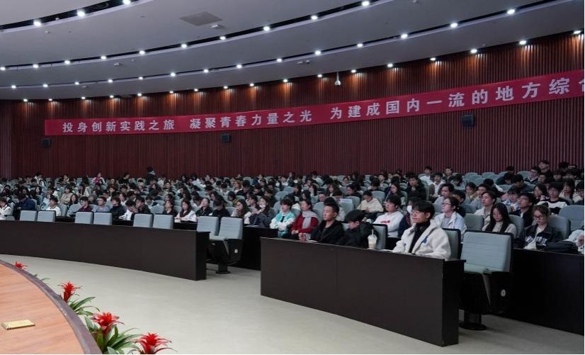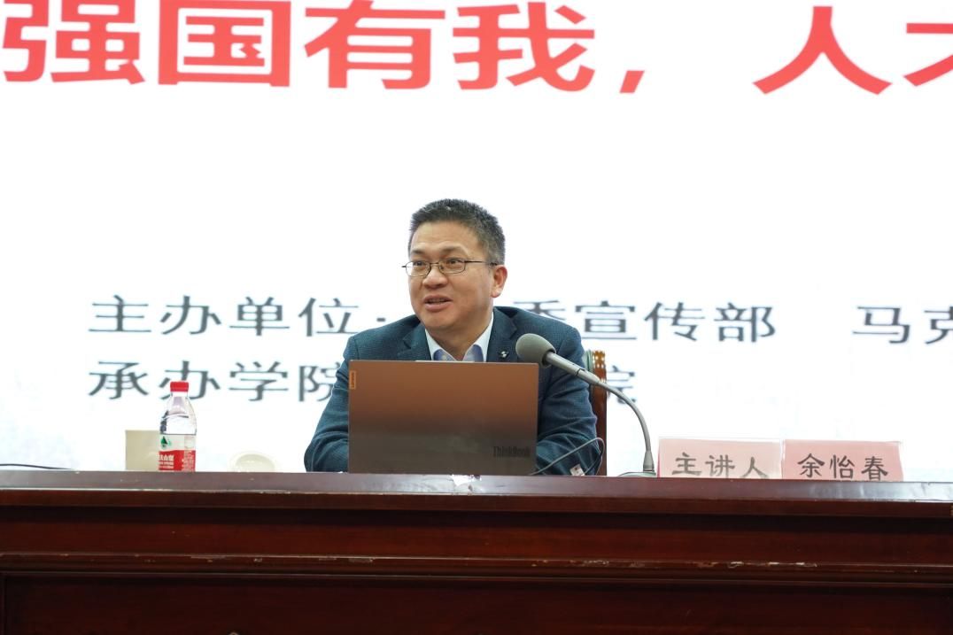 11月25日,h图书馆 党委委员、党(校)办主任、宣传部部长余怡春在真诚图书馆报告厅为h图书馆 420余名学生讲授“形势与政策”课,h图书馆 党委副书记吴敏主持活动。