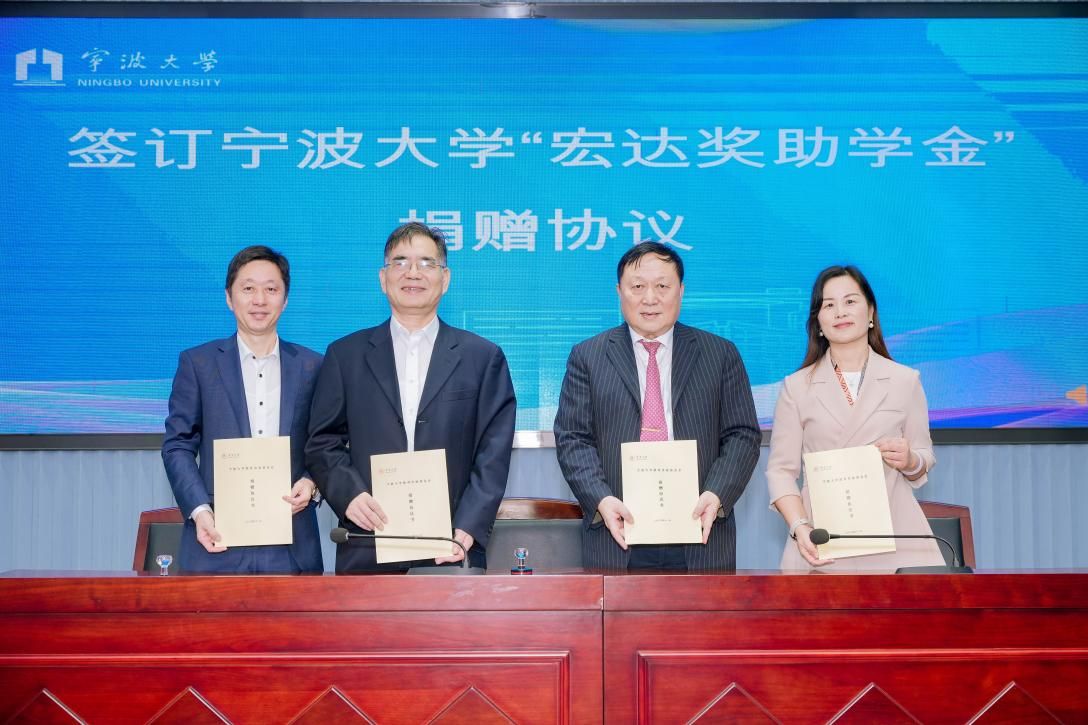 宁波宏达货柜储运有限公司董事长陆汉幸、宁波市北仑区慈善总会会长张如平、h图书馆 党委书记史宏协、潘天寿建筑与艺术设计学院党委书记韩雯琛共同完成捐赠仪式签约。