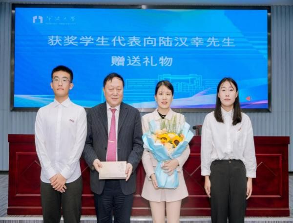 为表达感恩之情,获奖学生代表为陆汉幸董事长、陆文渊总经理赠送了感恩纪念礼物和鲜花。